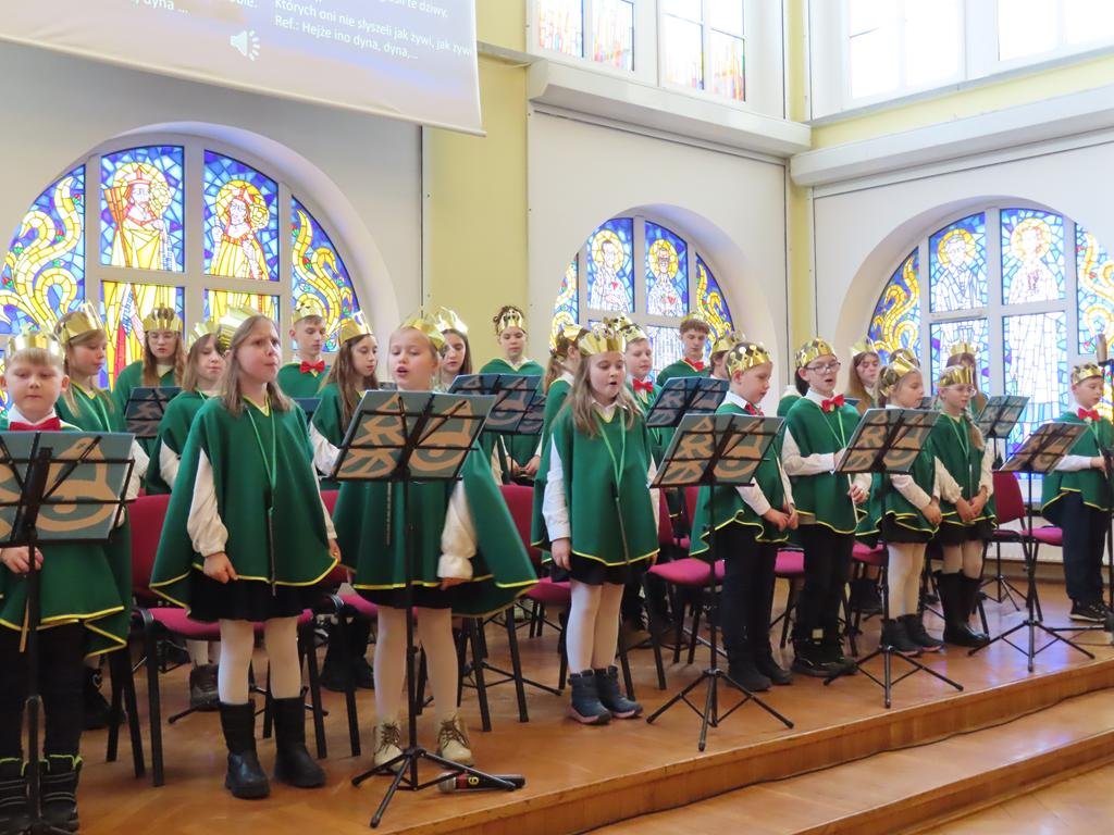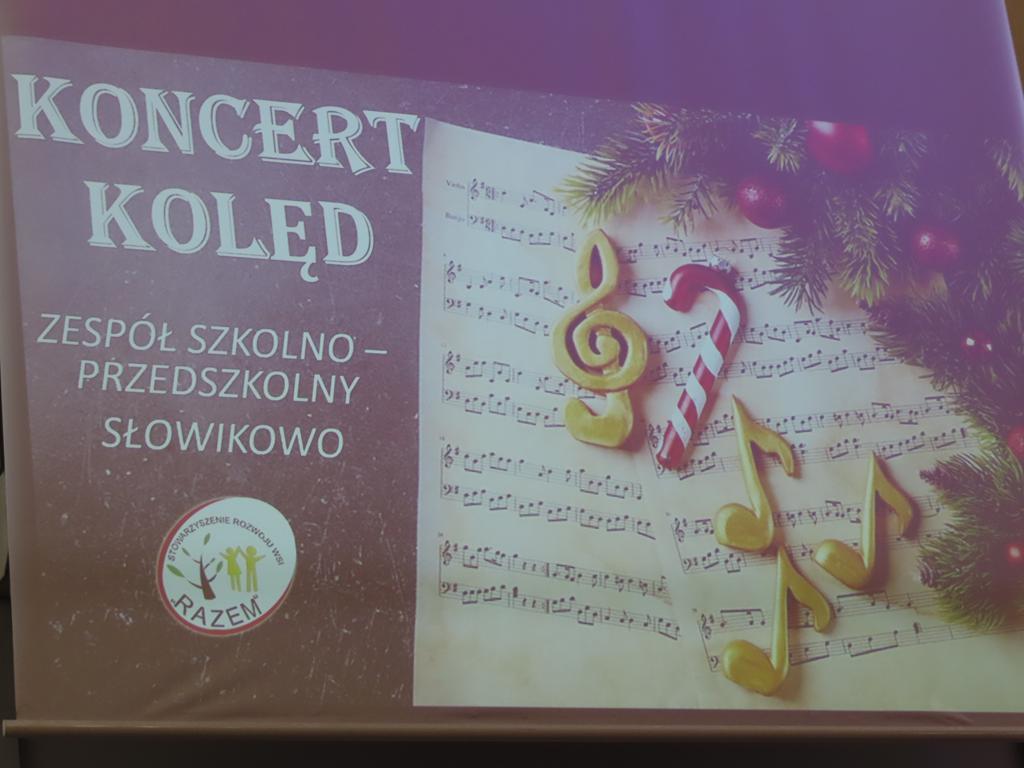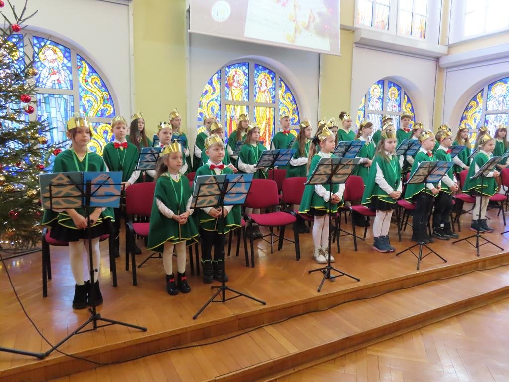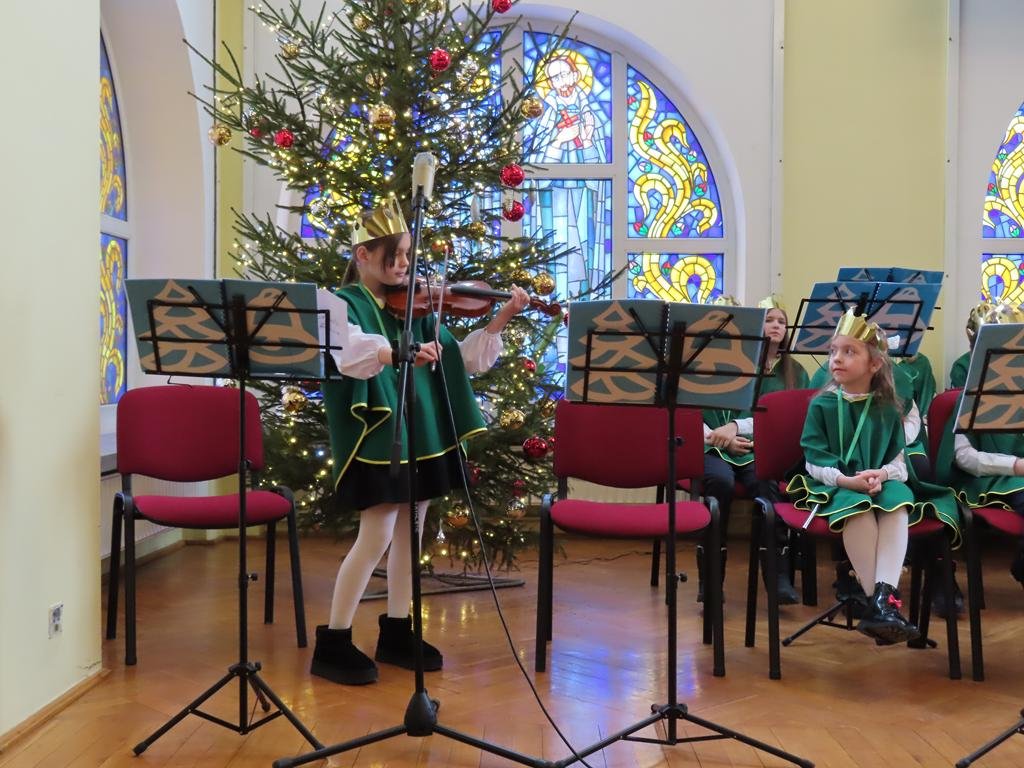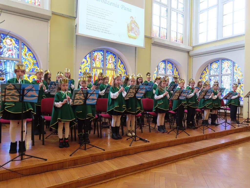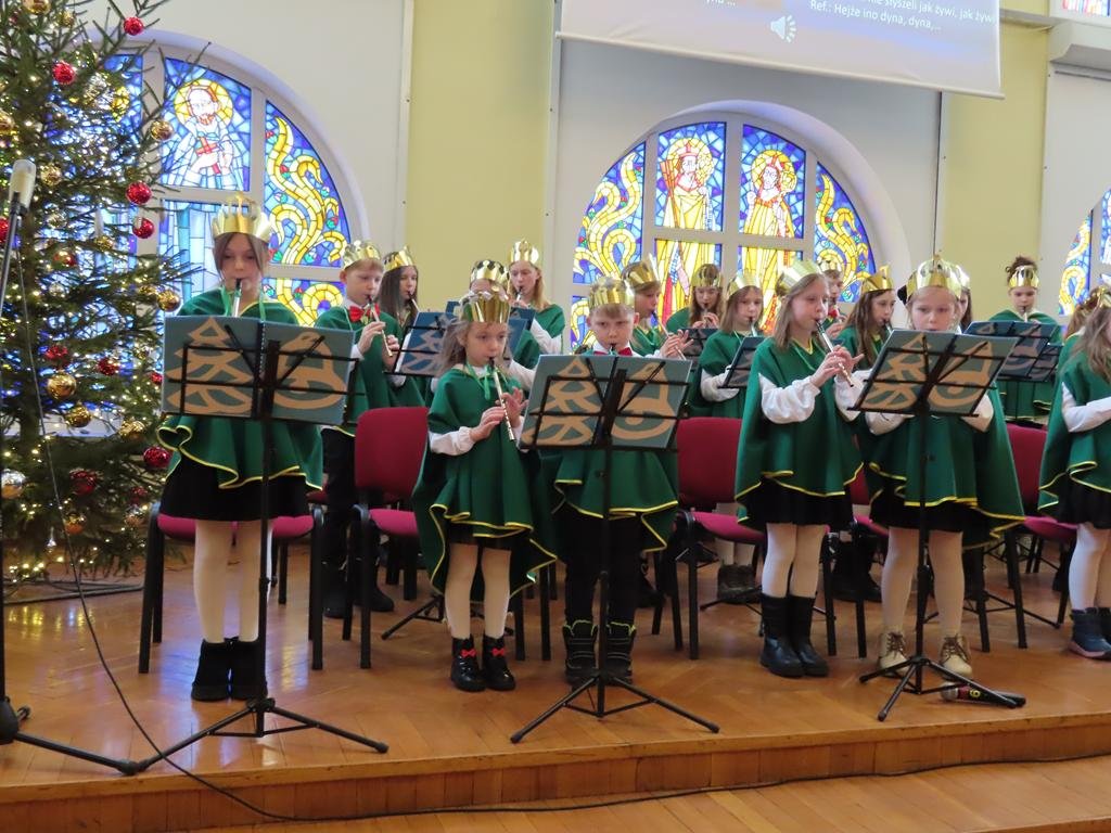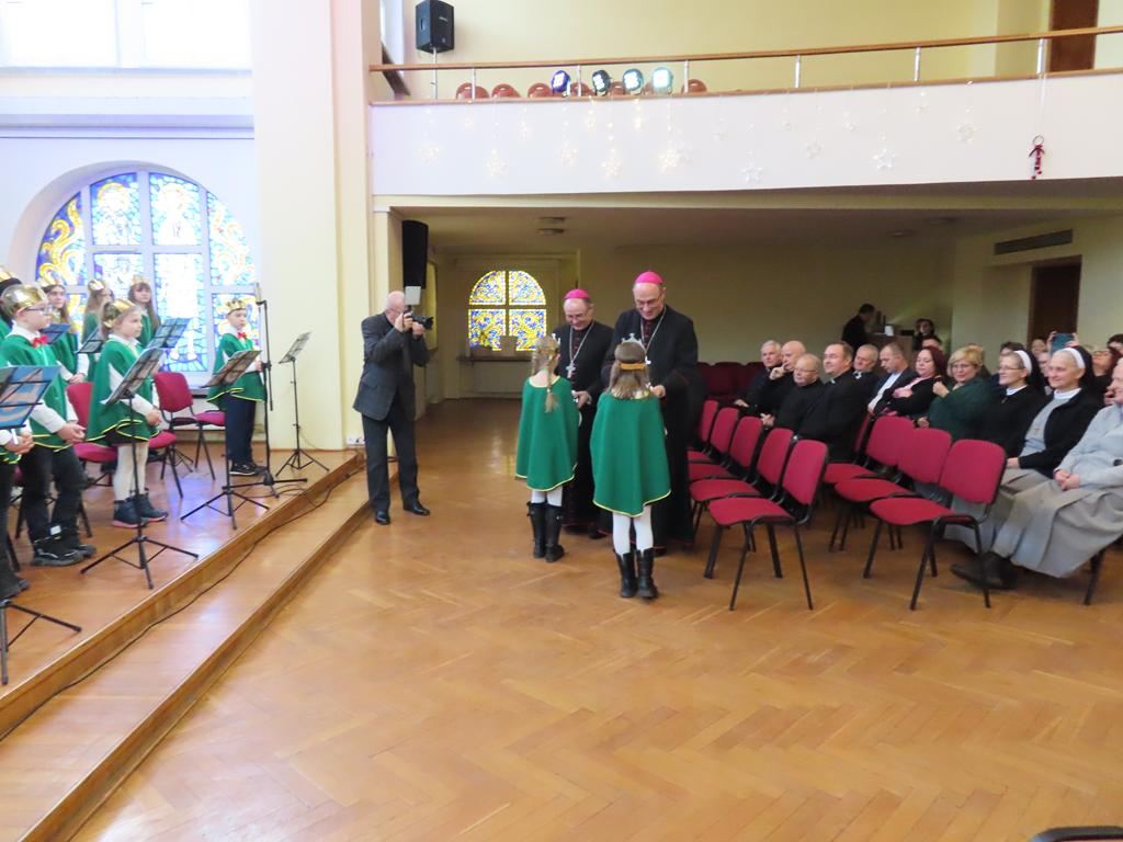 Pani dyrektor Renata Szumera zaprezentowała działalność i osiągnięcia szkoły w Słowikowie, prowadzonej przez  Stowarzyszenie Rozwoju Wsi „Razem” i zaprosiła do wysłuchania występu uczniów. Rozpoczął się koncert wokalno-instrumentalny polskich kolęd i pastorałek. Podczas jego trwania w tematykę okresu bożonarodzeniowego wprowadzał narrator Felek Woźniak.  Do śpiewu kolęd włączali się uczestnicy spotkania. Dwa utwory Marysia Kamińska zaśpiewała indywidualnie. Obok gry zespołowej na flażoletach można było posłuchać interpretacji solowych wykonywanych  na skrzypcach przez Gabrysię Grącką i na fortepianie przez Konrada Zielaznego.   Uczniowie za swój występ zostali nagrodzeni gromkimi brawami. Ks. abp Wojciech Polak podziękował dzieciom oraz opiekunom za trud włożony w zorganizowanie wspólnego kolędowania. Na ręce pani dyr. Renaty Szumera złożył kosz ze słodyczami dla młodych artystów.