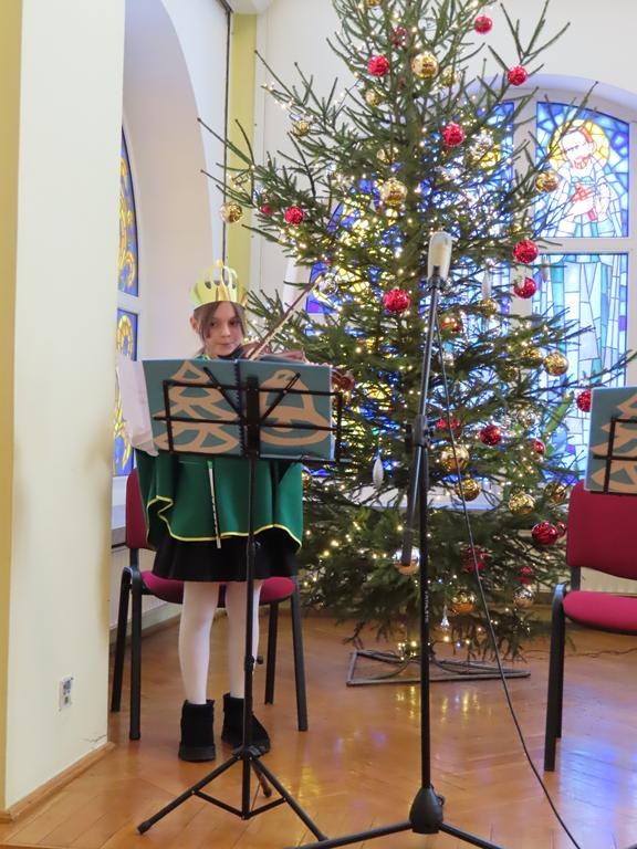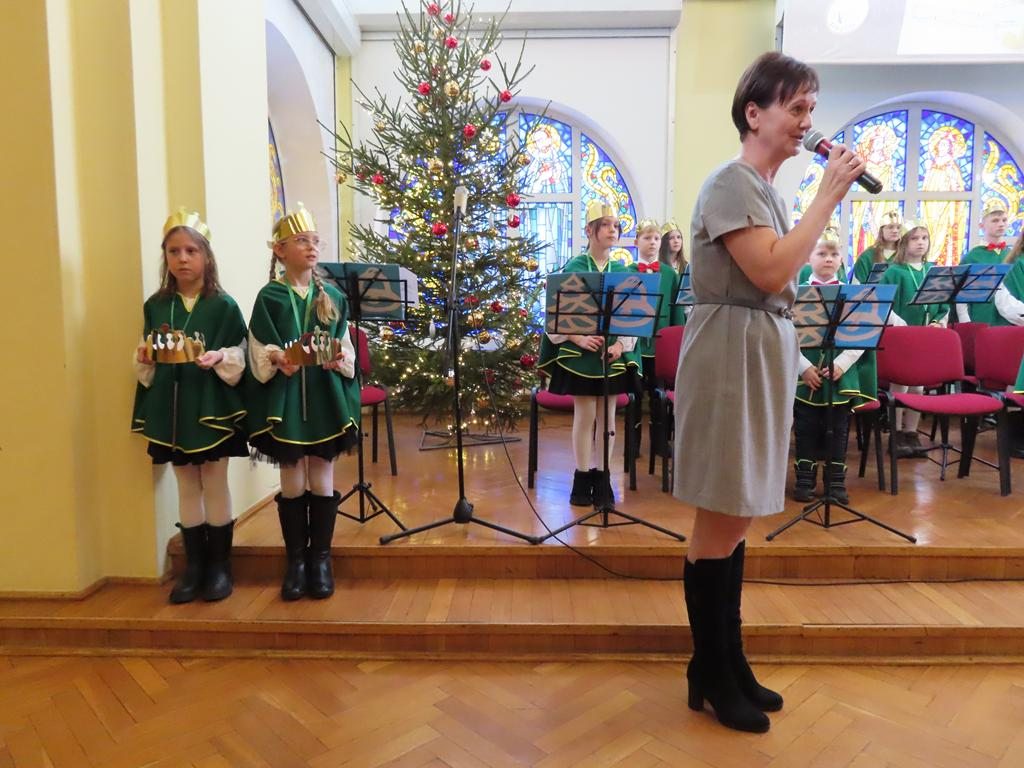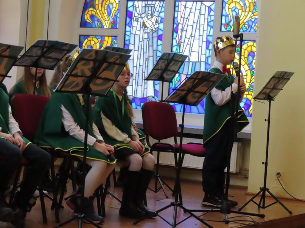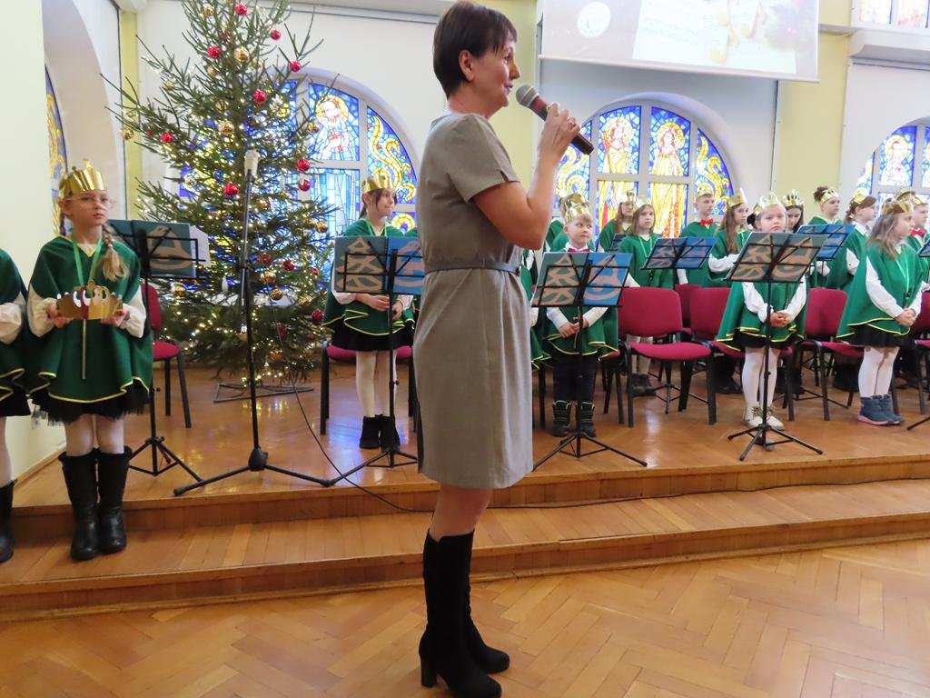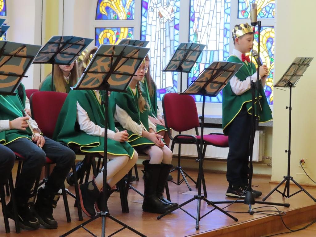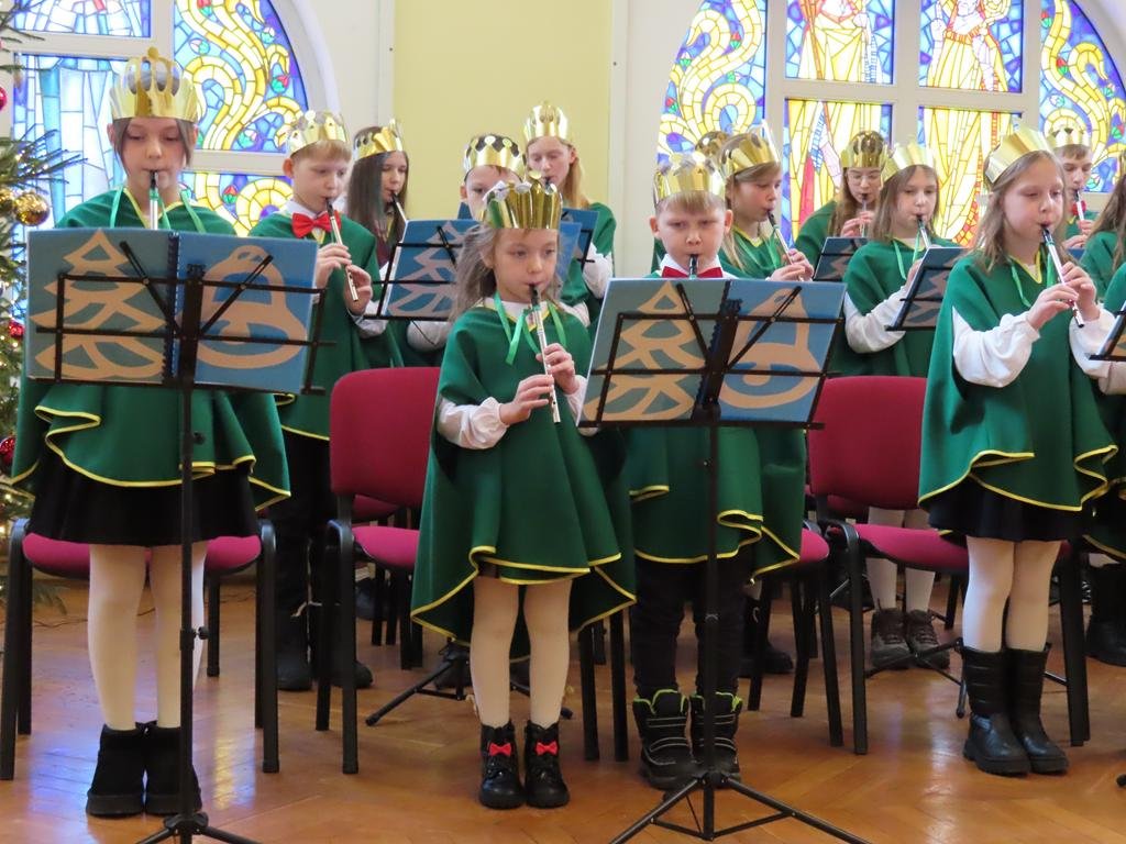 Pani dyrektor Renata Szumera zaprezentowała działalność i osiągnięcia szkoły w Słowikowie, prowadzonej przez  Stowarzyszenie Rozwoju Wsi „Razem” i zaprosiła do wysłuchania występu uczniów. Rozpoczął się koncert wokalno-instrumentalny polskich kolęd i pastorałek. Podczas jego trwania w tematykę okresu bożonarodzeniowego wprowadzał narrator Felek Woźniak.  Do śpiewu kolęd włączali się uczestnicy spotkania. Dwa utwory Marysia Kamińska zaśpiewała indywidualnie. Obok gry zespołowej na flażoletach można było posłuchać interpretacji solowych wykonywanych  na skrzypcach przez Gabrysię Grącką i na fortepianie przez Konrada Zielaznego.   Uczniowie za swój występ zostali nagrodzeni gromkimi brawami. Ks. abp Wojciech Polak podziękował dzieciom oraz opiekunom za trud włożony w zorganizowanie wspólnego kolędowania. Na ręce pani dyr. Renaty Szumera złożył kosz ze słodyczami dla młodych artystów.
