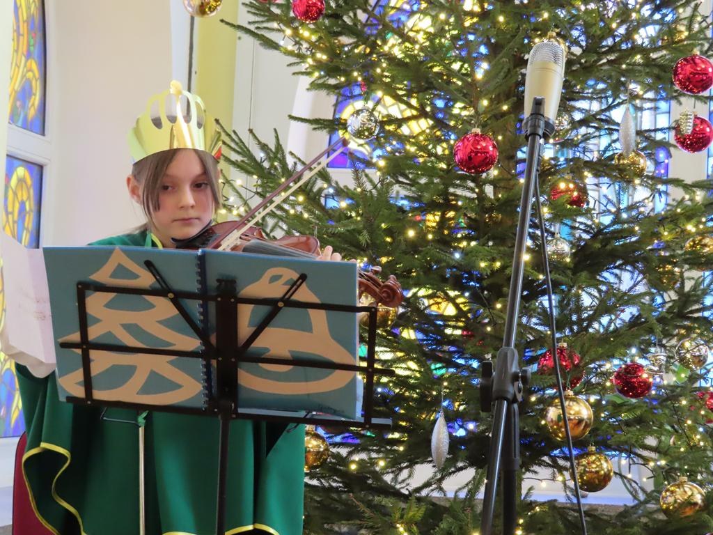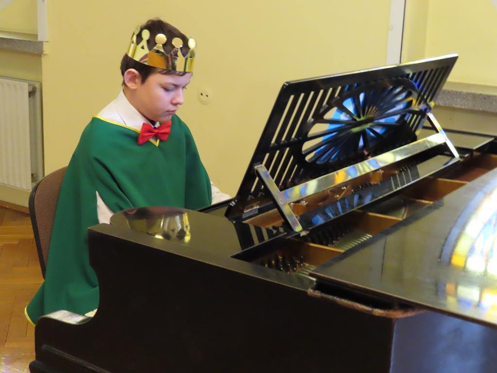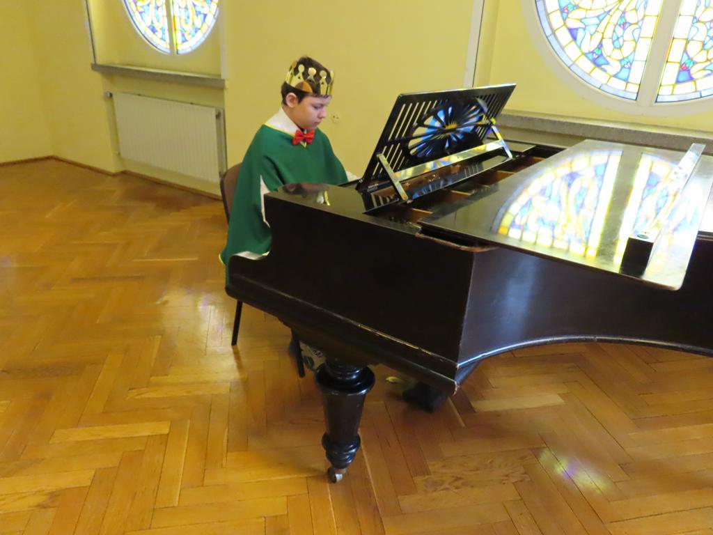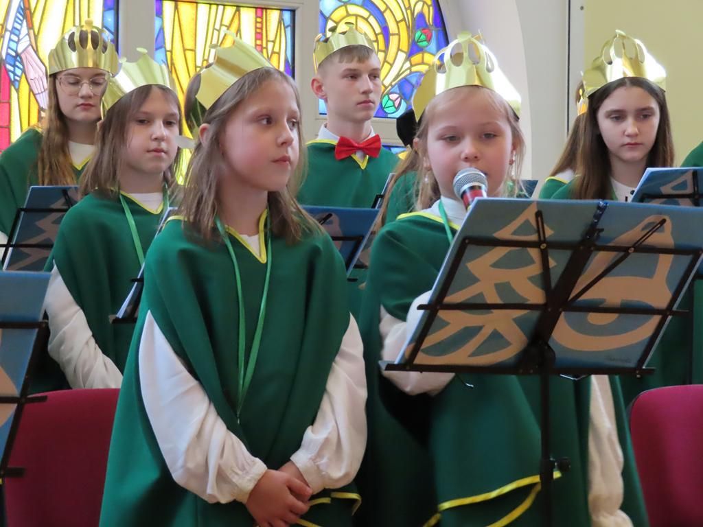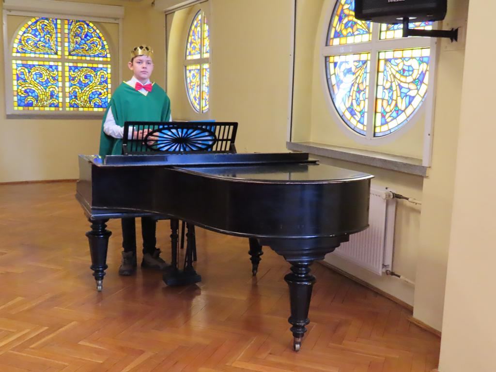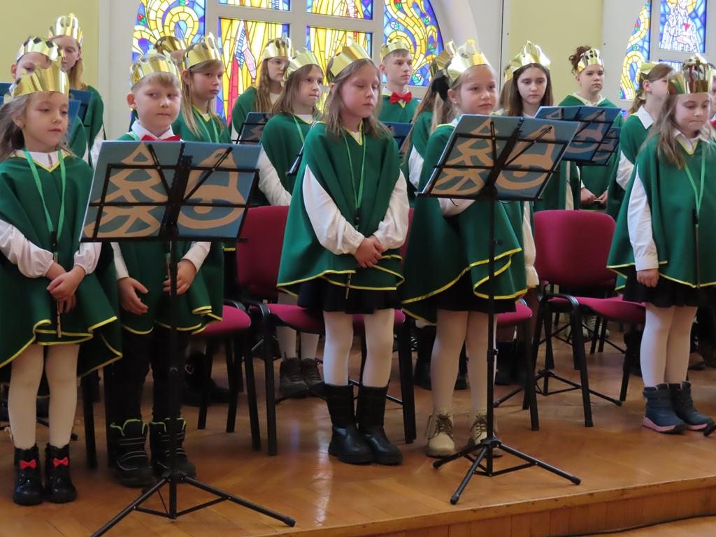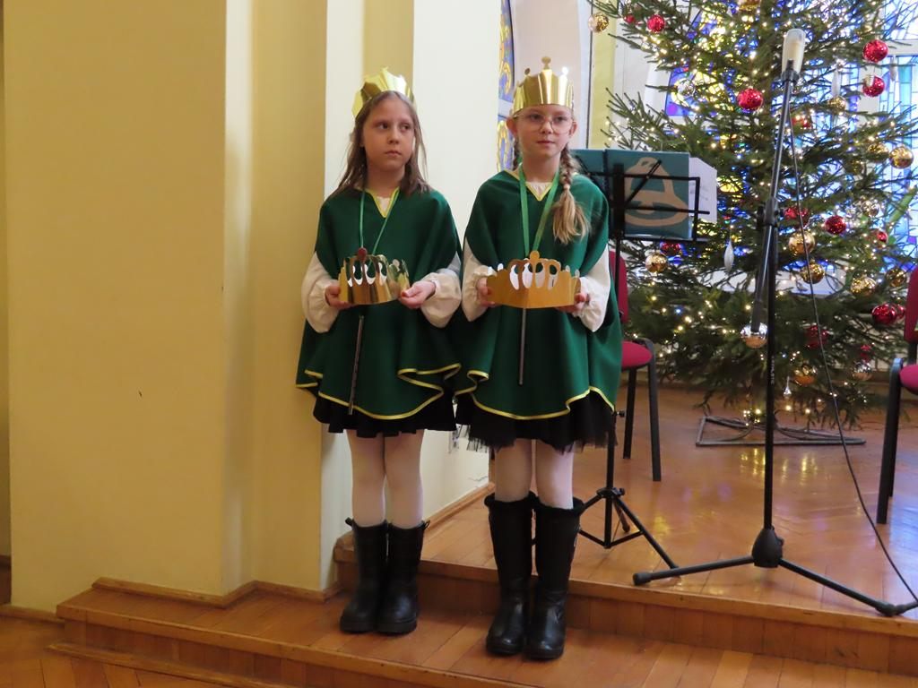 Pani dyrektor Renata Szumera zaprezentowała działalność i osiągnięcia szkoły w Słowikowie, prowadzonej przez  Stowarzyszenie Rozwoju Wsi „Razem” i zaprosiła do wysłuchania występu uczniów. Rozpoczął się koncert wokalno-instrumentalny polskich kolęd i pastorałek. Podczas jego trwania w tematykę okresu bożonarodzeniowego wprowadzał narrator Felek Woźniak.  Do śpiewu kolęd włączali się uczestnicy spotkania. Dwa utwory Marysia Kamińska zaśpiewała indywidualnie. Obok gry zespołowej na flażoletach można było posłuchać interpretacji solowych wykonywanych  na skrzypcach przez Gabrysię Grącką i na fortepianie przez Konrada Zielaznego.   Uczniowie za swój występ zostali nagrodzeni gromkimi brawami. Ks. abp Wojciech Polak podziękował dzieciom oraz opiekunom za trud włożony w zorganizowanie wspólnego kolędowania. Na ręce pani dyr. Renaty Szumera złożył kosz ze słodyczami dla młodych artystów.