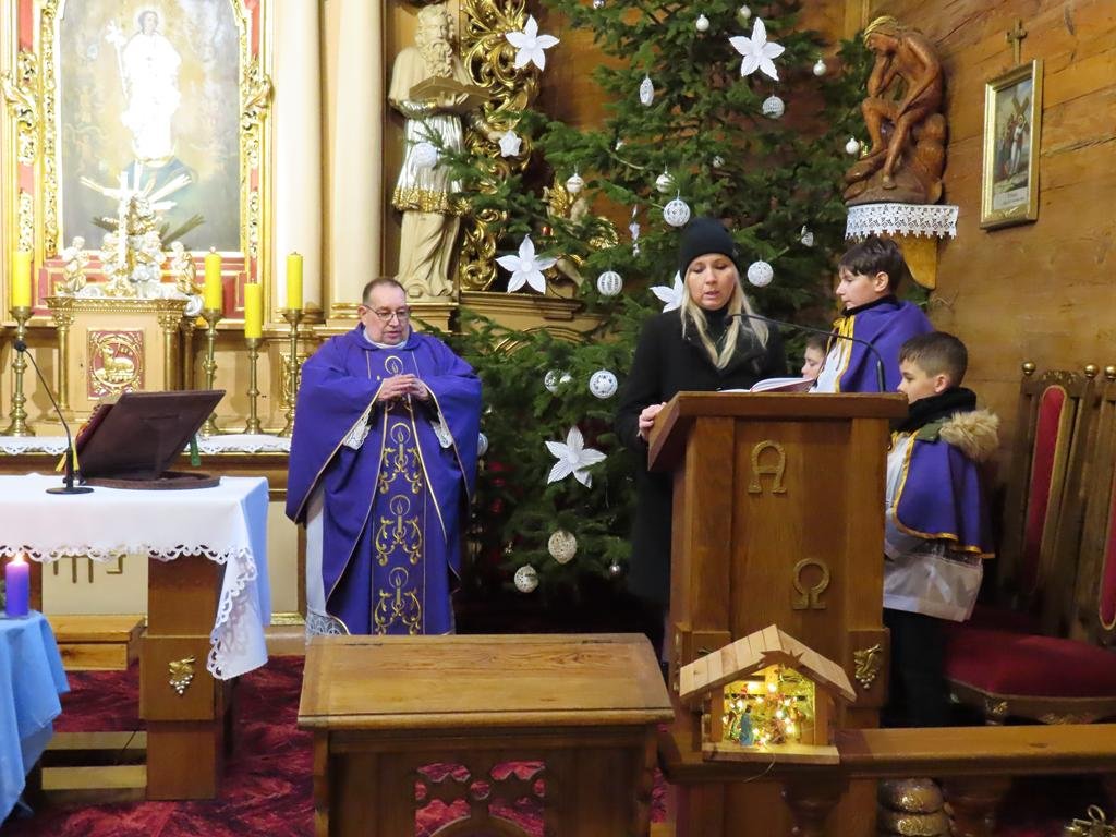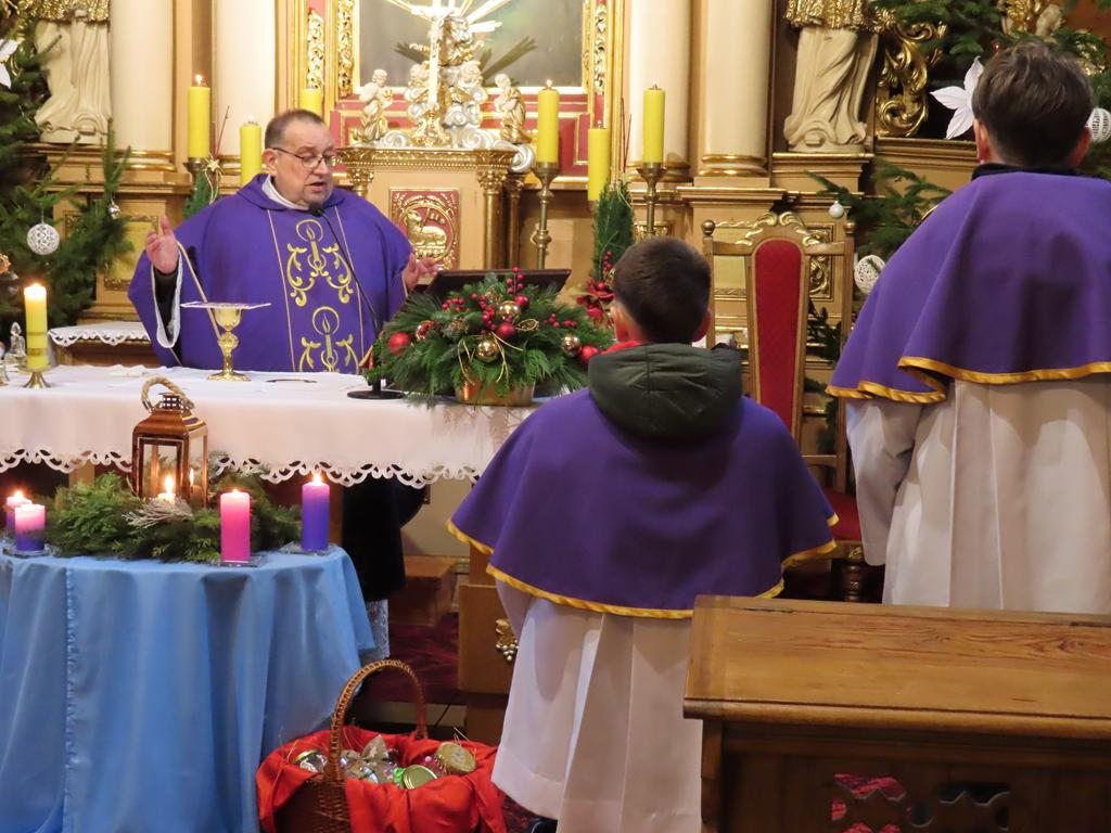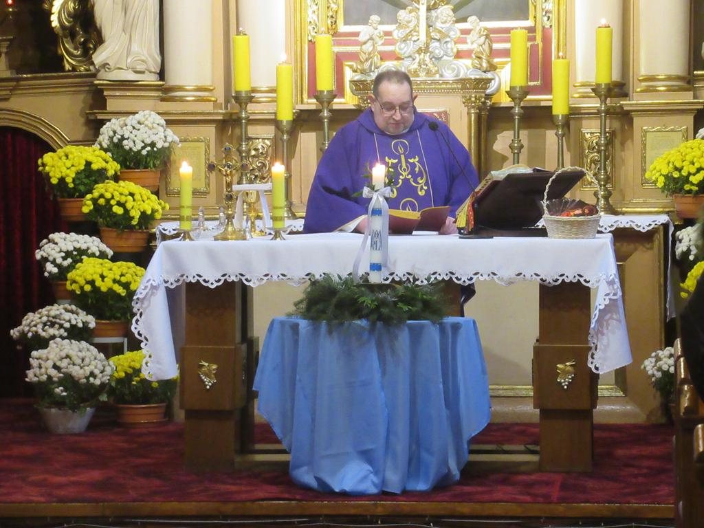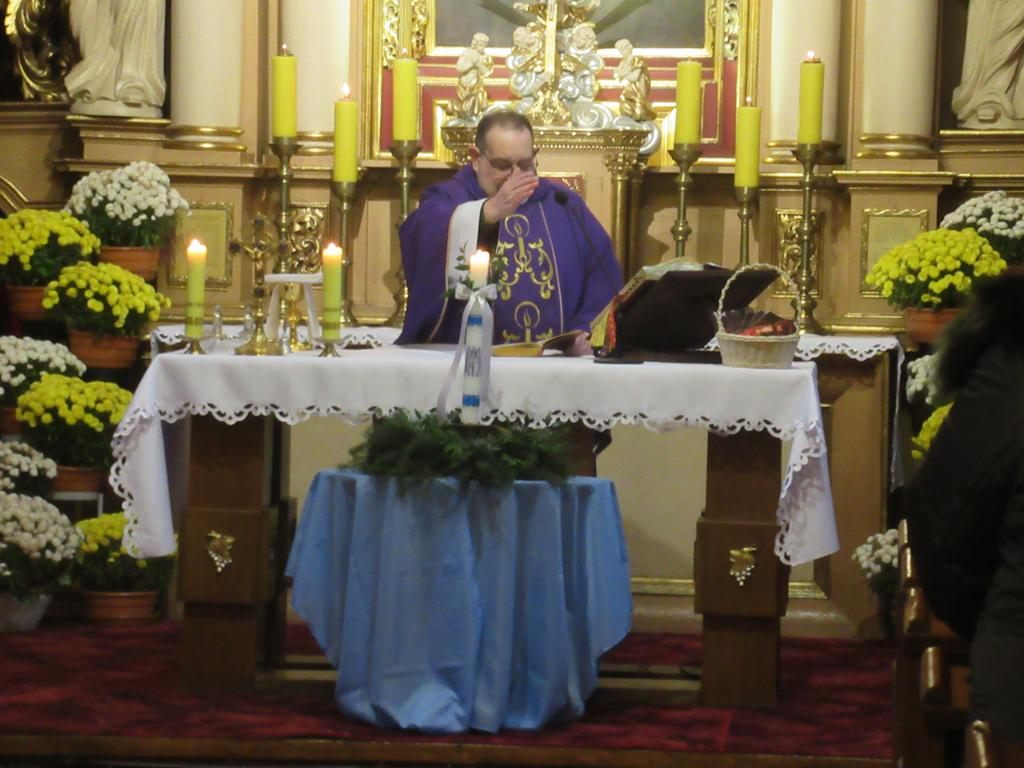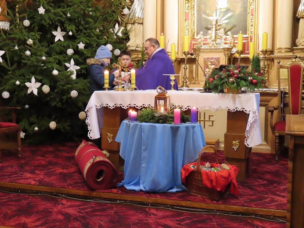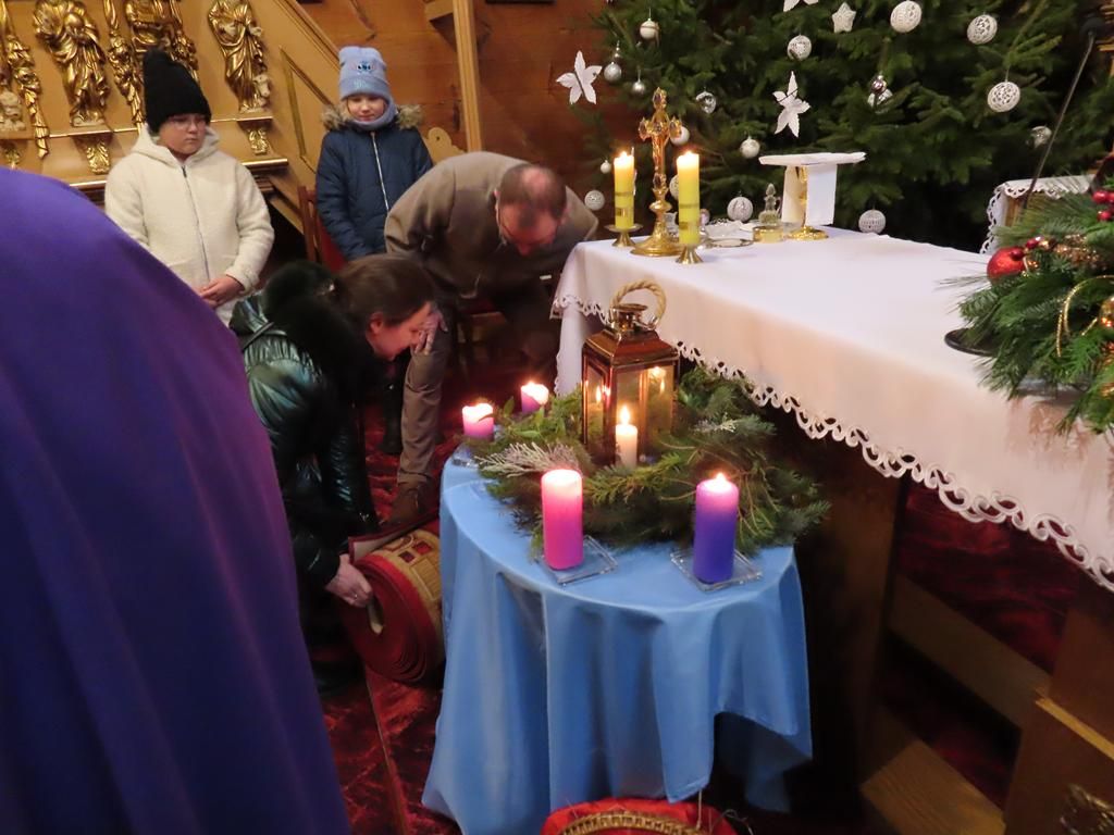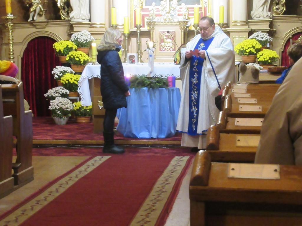 W ostatnią niedzielę adwentu w liturgię słowa oraz przygotowanie darów ołtarza włączyli się parafianie ze Słowikowa i Rękawczyna. Na czele procesji z darami kroczyły zuchy z Zespołu Szkolno – Przedszkolnego ze Słowikowa niosące lampion z Betlejemskim Światełkiem Pokoju. Ksiądz proboszcz umieścił je pośrodku wieńca adwentowego. Z rąk harcerzy odebrał ampułki z winem i wodą oraz hostię. Dziewczynki przyniosły kosz ze słoikami wypełnionymi dobrymi uczynkami adwentowymi. Panie wręczyły wykonane przez siebie stroiki, które ozdobią ołtarz na Boże Narodzenie. Przedstawiciele Rękawczyna i Słowikowa przekazali ufundowany przez mieszkańców tych wiosek chodnik do głównej nawy kościoła. Ksiądz proboszcz podziękował za wspólną modlitwę, za dary i niespodziankę.