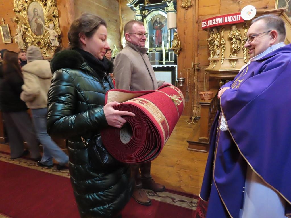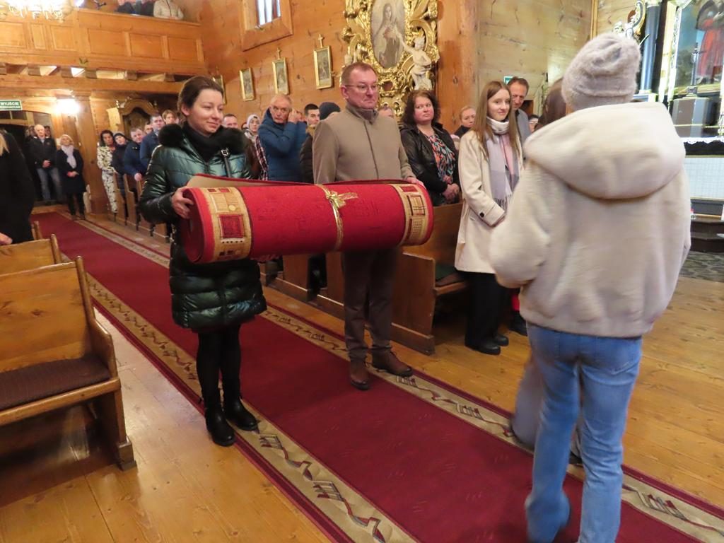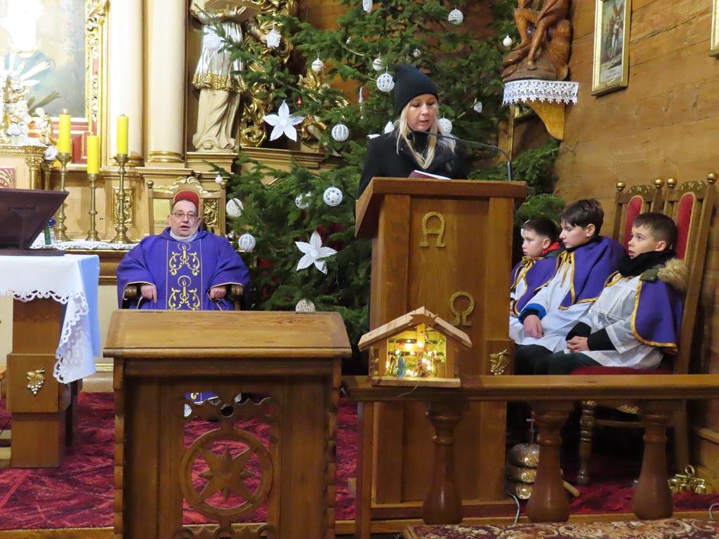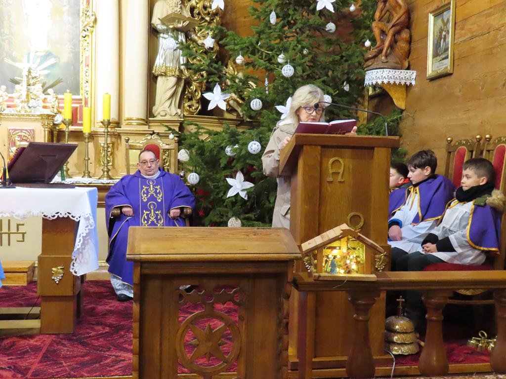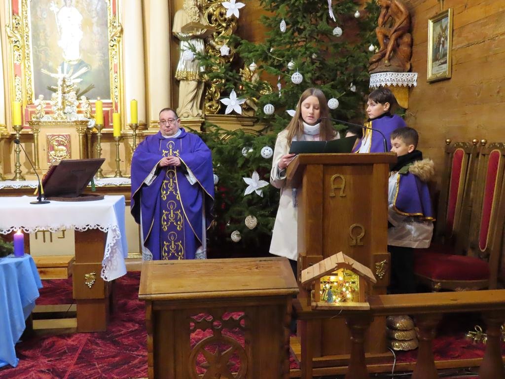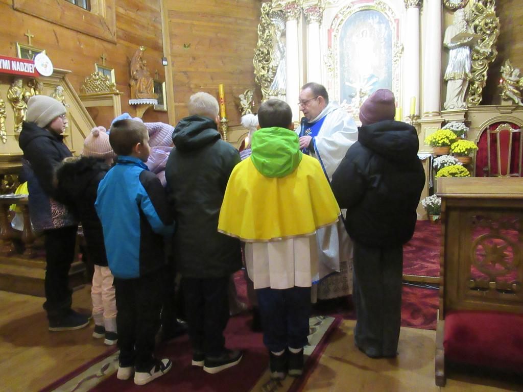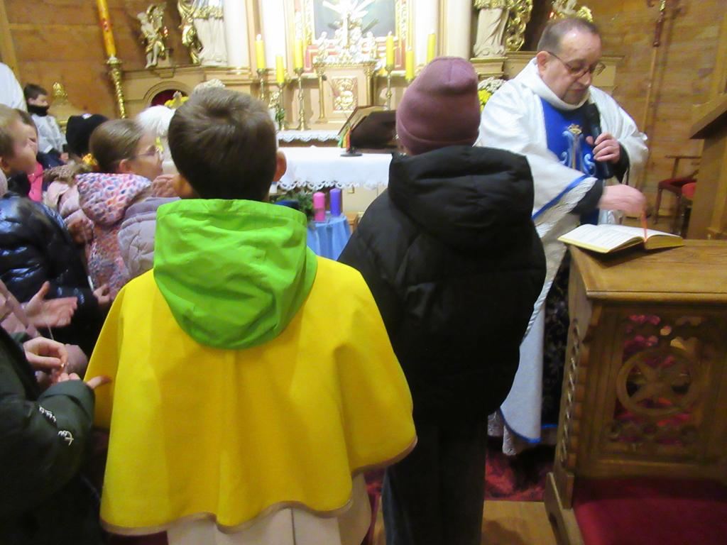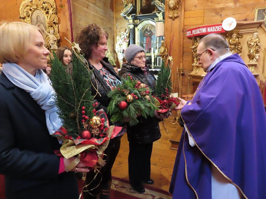 W ostatnią niedzielę adwentu w liturgię słowa oraz przygotowanie darów ołtarza włączyli się parafianie ze Słowikowa i Rękawczyna. Na czele procesji z darami kroczyły zuchy z Zespołu Szkolno – Przedszkolnego ze Słowikowa niosące lampion z Betlejemskim Światełkiem Pokoju. Ksiądz proboszcz umieścił je pośrodku wieńca adwentowego. Z rąk harcerzy odebrał ampułki z winem i wodą oraz hostię. Dziewczynki przyniosły kosz ze słoikami wypełnionymi dobrymi uczynkami adwentowymi. Panie wręczyły wykonane przez siebie stroiki, które ozdobią ołtarz na Boże Narodzenie. Przedstawiciele Rękawczyna i Słowikowa przekazali ufundowany przez mieszkańców tych wiosek chodnik do głównej nawy kościoła. Ksiądz proboszcz podziękował za wspólną modlitwę, za dary i niespodziankę.