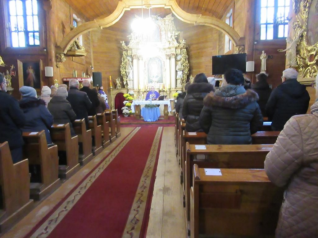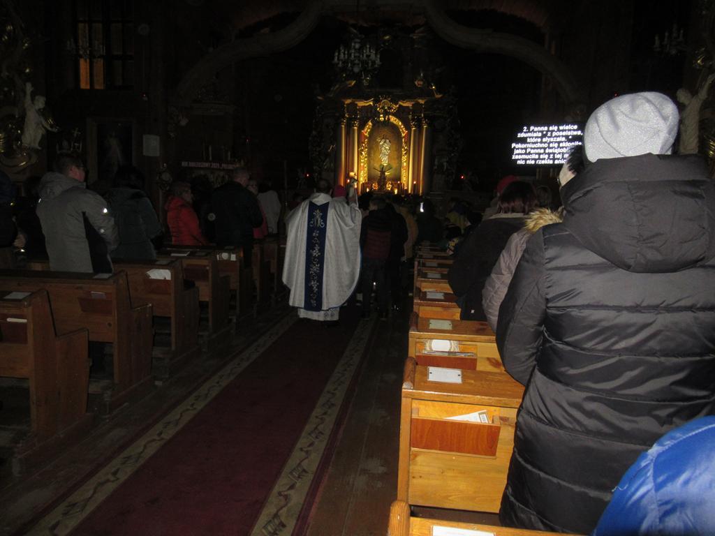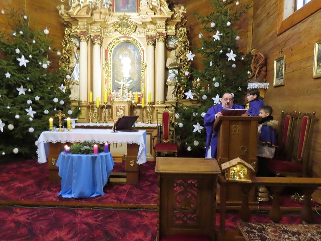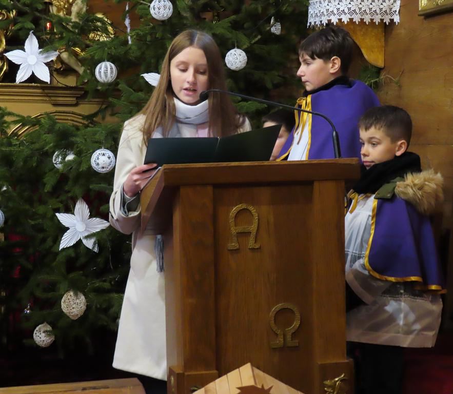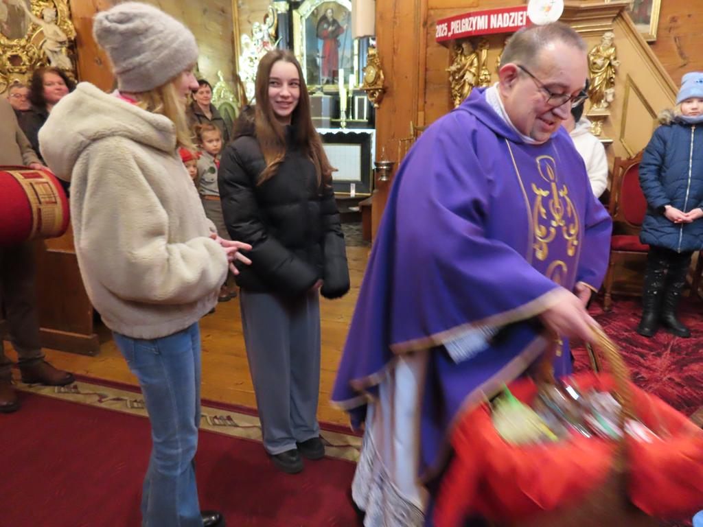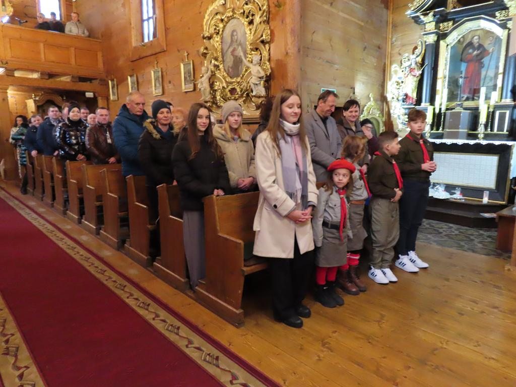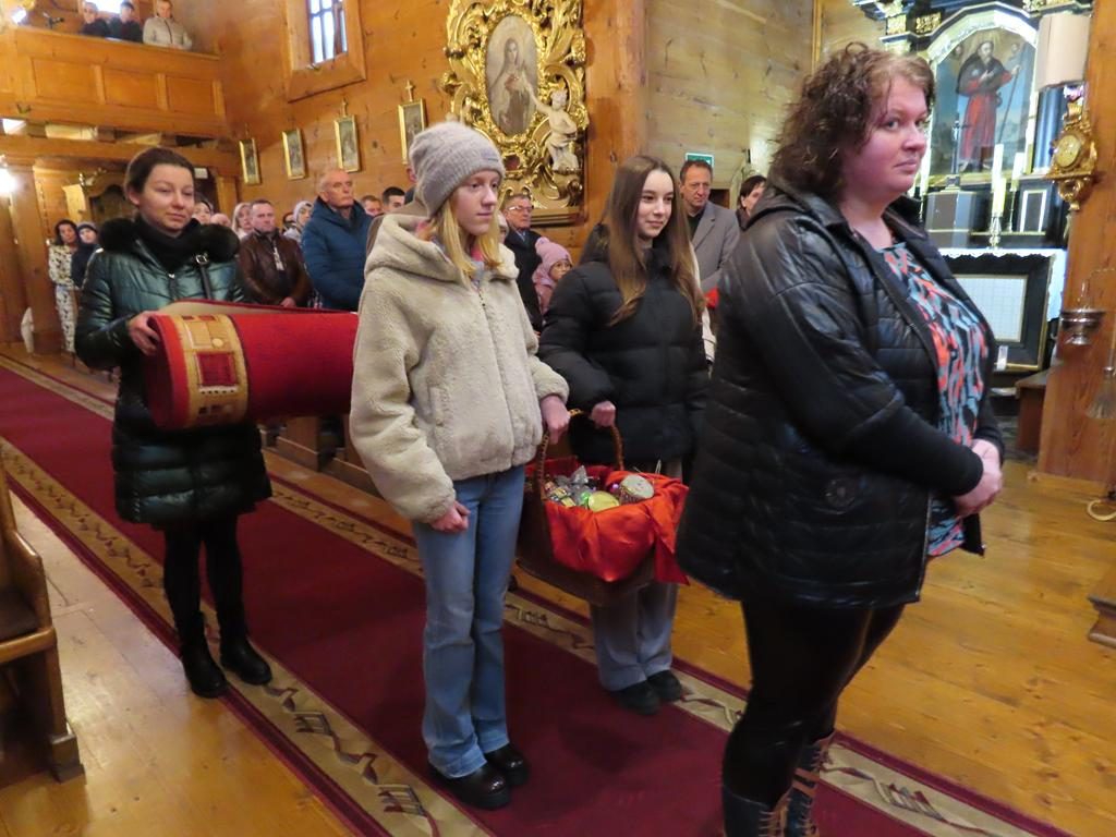 W ostatnią niedzielę adwentu w liturgię słowa oraz przygotowanie darów ołtarza włączyli się parafianie ze Słowikowa i Rękawczyna. Na czele procesji z darami kroczyły zuchy z Zespołu Szkolno – Przedszkolnego ze Słowikowa niosące lampion z Betlejemskim Światełkiem Pokoju. Ksiądz proboszcz umieścił je pośrodku wieńca adwentowego. Z rąk harcerzy odebrał ampułki z winem i wodą oraz hostię. Dziewczynki przyniosły kosz ze słoikami wypełnionymi dobrymi uczynkami adwentowymi. Panie wręczyły wykonane przez siebie stroiki, które ozdobią ołtarz na Boże Narodzenie. Przedstawiciele Rękawczyna i Słowikowa przekazali ufundowany przez mieszkańców tych wiosek chodnik do głównej nawy kościoła. Ksiądz proboszcz podziękował za wspólną modlitwę, za dary i niespodziankę.