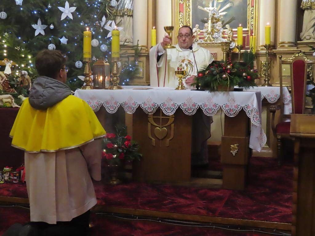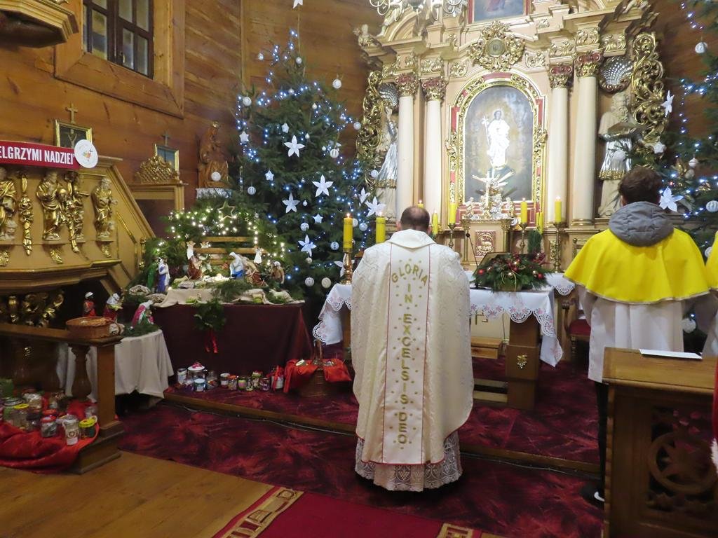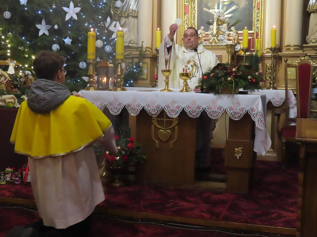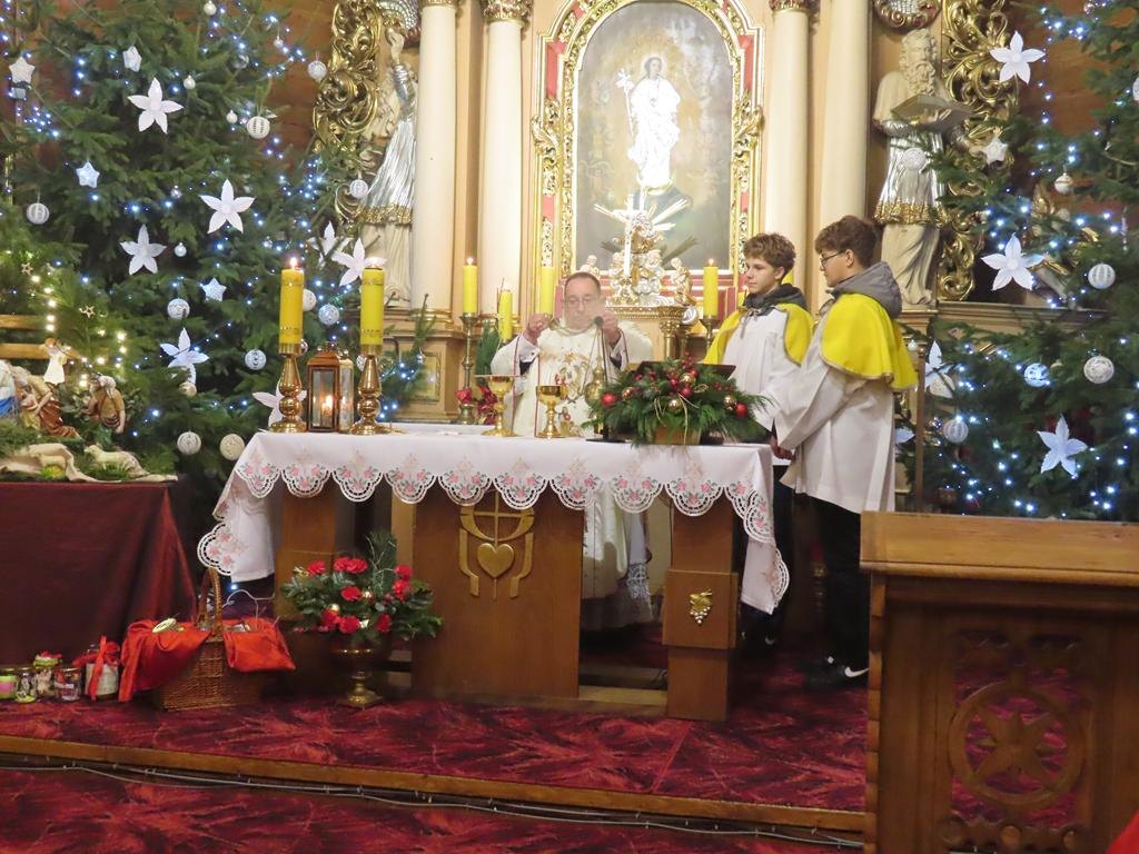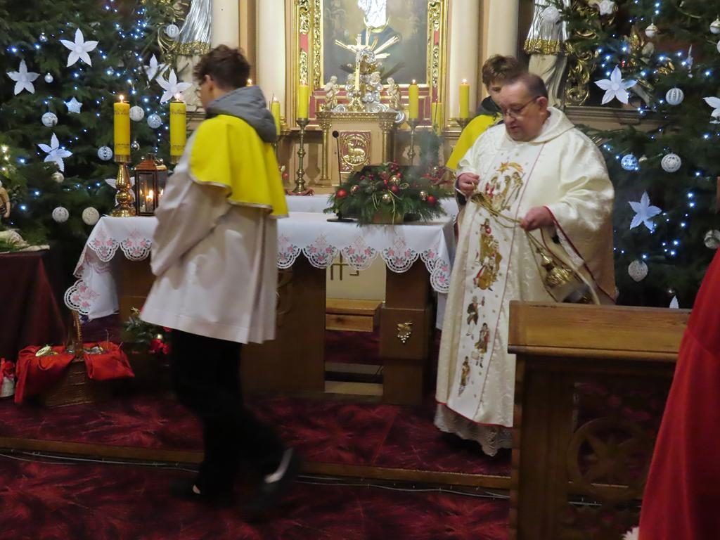 W świątyni pogrążonej w ciszy, mroku, przed pustym jeszcze żłóbkiem parafianie i goście oczekiwali na rozpoczęcie Mszy św. z Uroczystości Narodzenia Pańskiego. O północy, przy śpiewie kolędy „Wśród nocnej ciszy”, do świątyni wkroczyła procesja z figurką Dzieciątka Jezus. Po jej złożeniu w żłóbku kapłan odczytał fragment z Martyrologium Kościoła Rzymskiego, przybliżający i wyjaśniający wybrane wydarzenia z historii zbawienia, aż do Bożego Narodzenia.