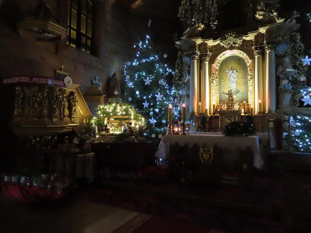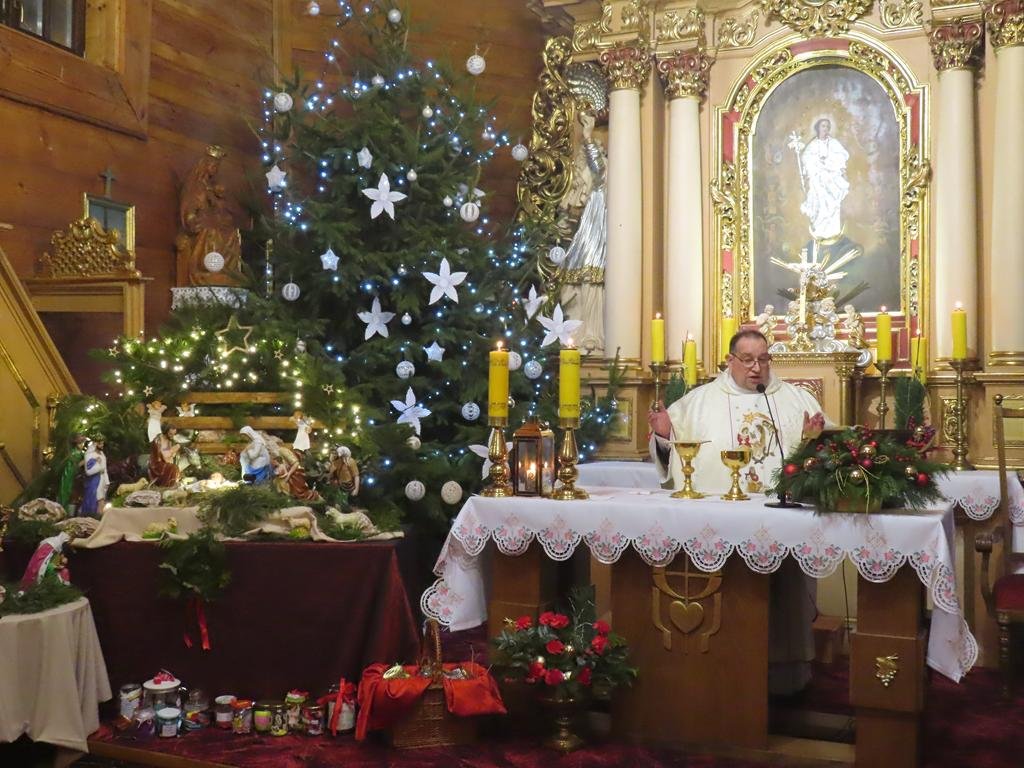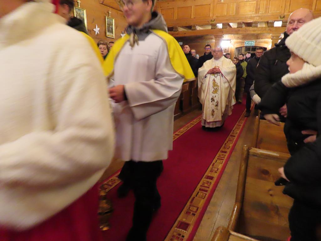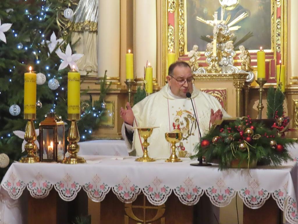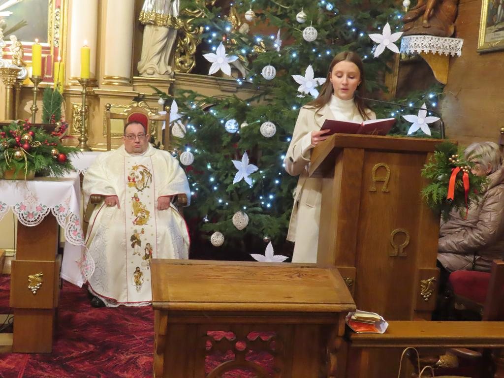 W świątyni pogrążonej w ciszy, mroku, przed pustym jeszcze żłóbkiem parafianie i goście oczekiwali na rozpoczęcie Mszy św. z Uroczystości Narodzenia Pańskiego. O północy, przy śpiewie kolędy „Wśród nocnej ciszy”, do świątyni wkroczyła procesja z figurką Dzieciątka Jezus. Po jej złożeniu w żłóbku kapłan odczytał fragment z Martyrologium Kościoła Rzymskiego, przybliżający i wyjaśniający wybrane wydarzenia z historii zbawienia, aż do Bożego Narodzenia.
