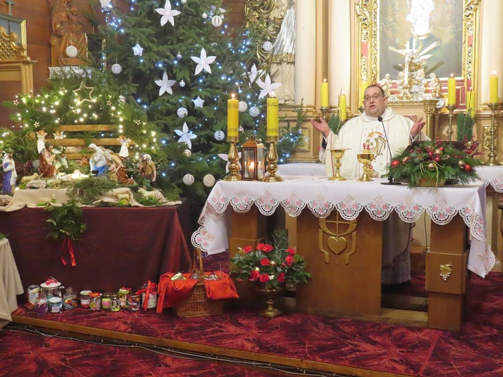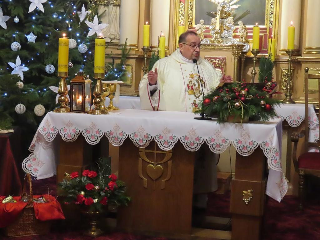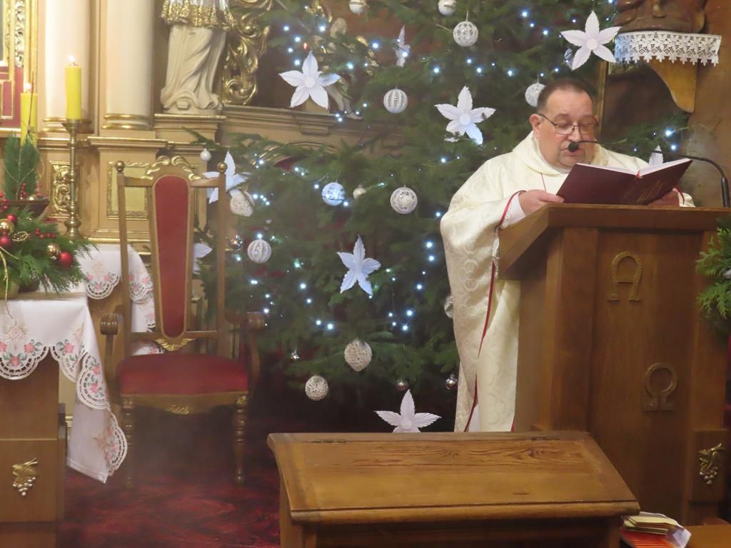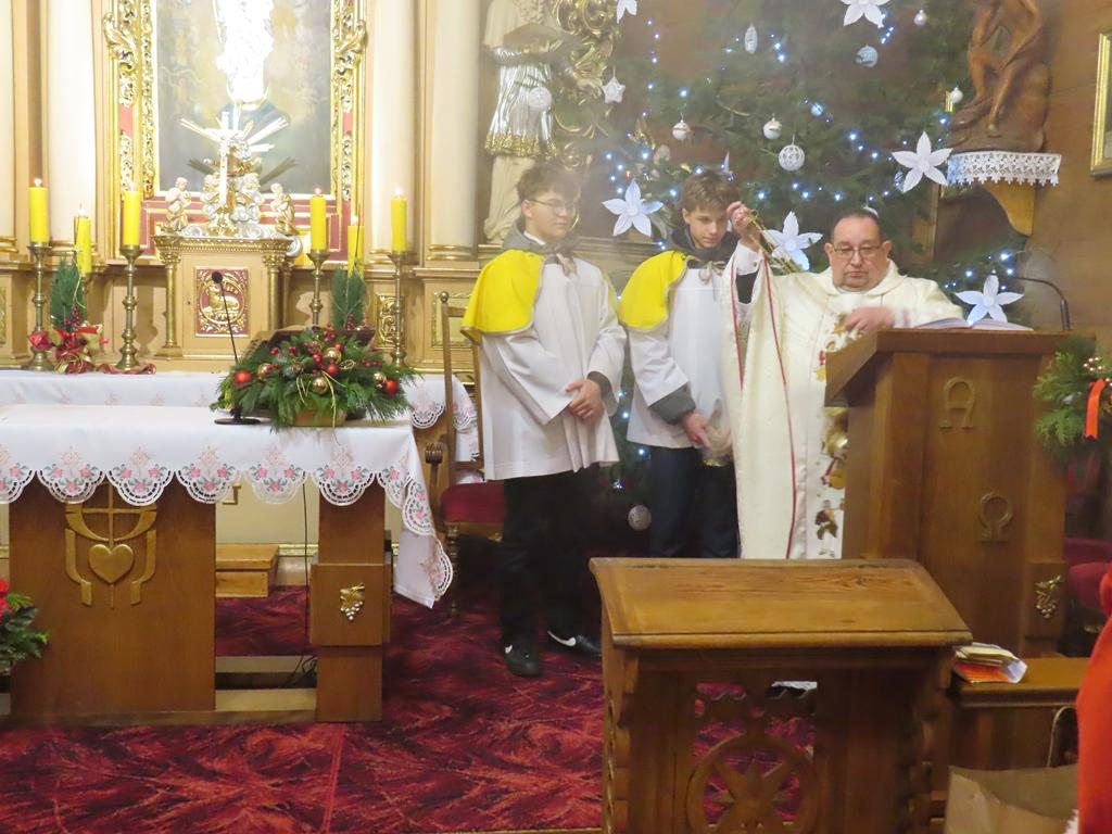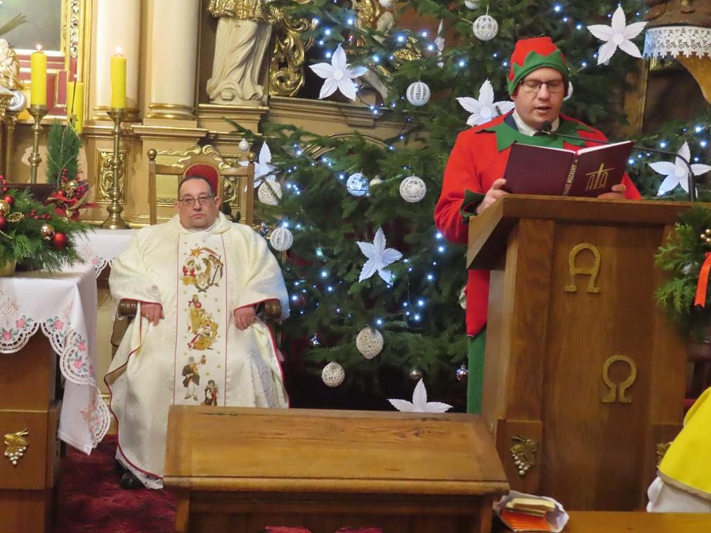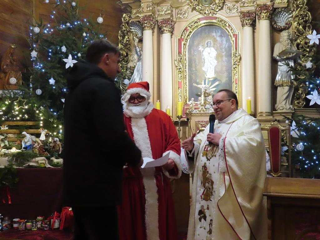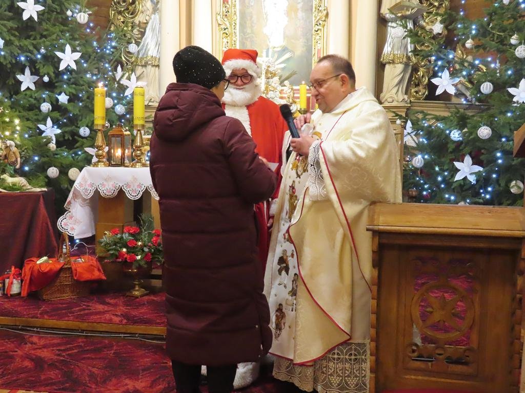 Po zakończeniu Mszy św. ksiądz proboszcz podziękował parafianom w szczególny sposób zaangażowanych w działalność na rzecz rozwoju wspólnoty parafialnej. Gwiazdor każdej z tych osób wręczył świąteczny upominek. Przedstawicielki Rady Parafialnej w imieniu wszystkich parafian podziękowały księdzu proboszczowi za opiekę duchową oraz wszelkie prace prowadzone na rzecz rozwoju parafii. Wraz z panią kościelną wręczyły świąteczny upominek. Prezentem gwiazdkowym dla parafii były nowe obrusy na ołtarze oraz ornat z motywami nawiązującymi do świąt Bożego Narodzenia.