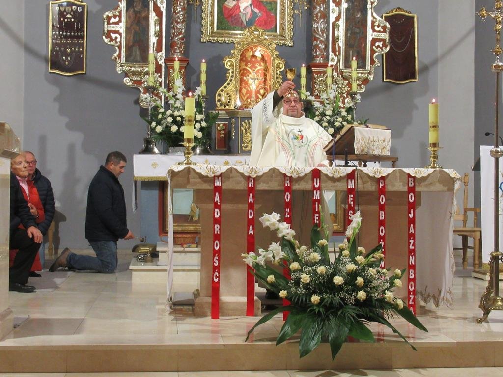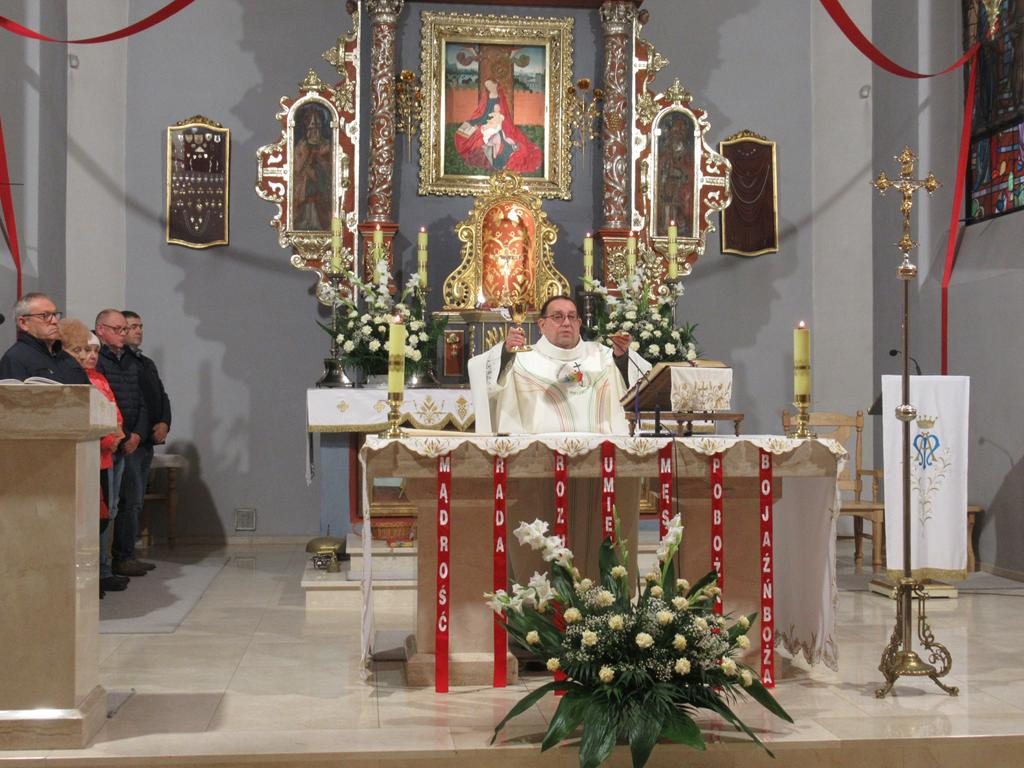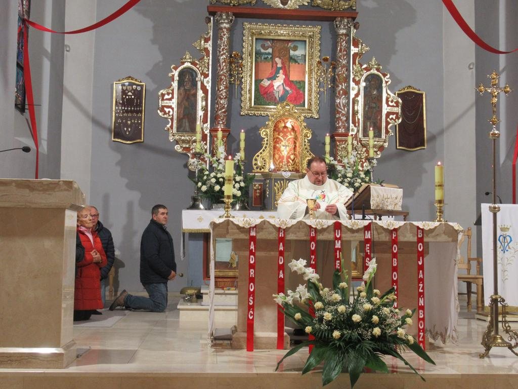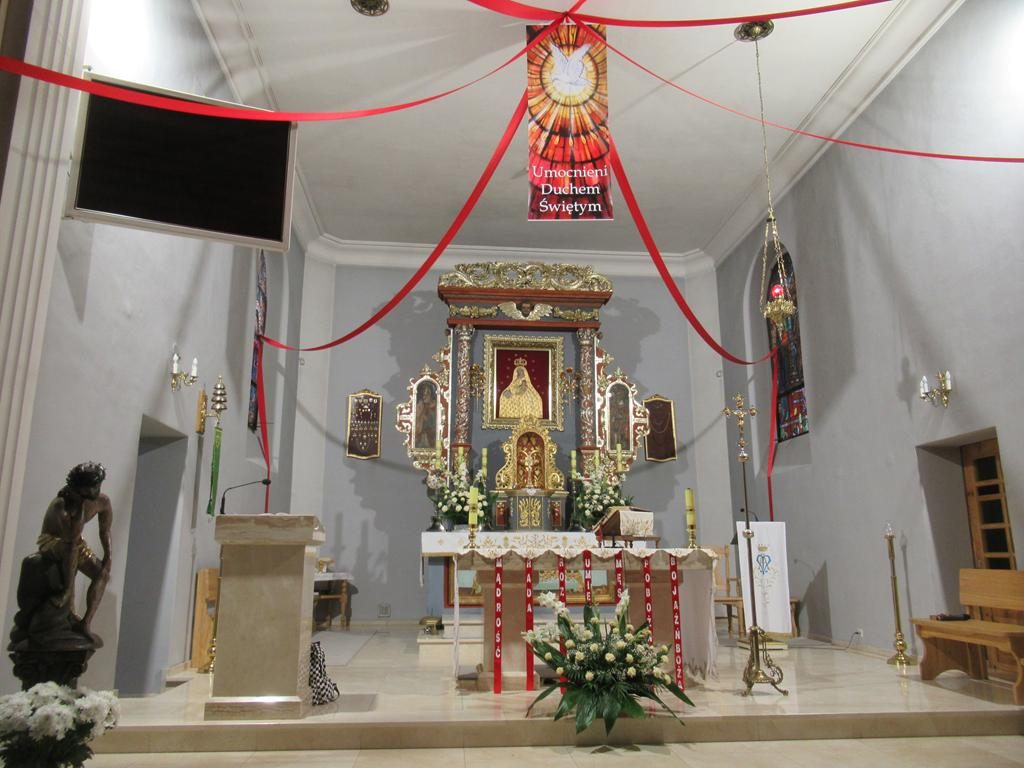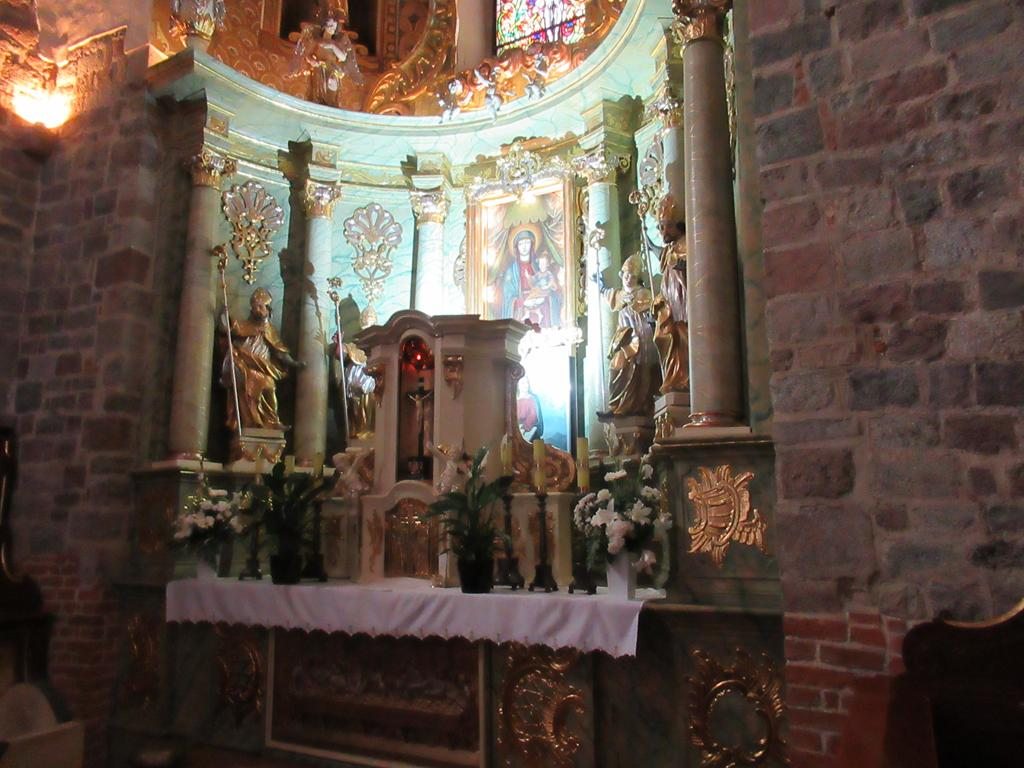 Ostatnim miejscem pielgrzymowania był Gościeszyn. W kościele p.w. Nawiedzenia Najświętszej Maryi Panny ksiądz proboszcz odprawił Mszę św. w intencji pielgrzymów oraz parafian z Kamieńca i Szydłowa. Po Eucharystii proboszcz tamtejszej parafii przybliżył historię obrazu Matki Bożej Gościeszyńskiej. Zapoznał z bogatą symboliką zawartą na namalowanym w latach 1480-1490 wizerunku „Matki Boskiej z Dzieciątkiem w ogrodzie mistycznym.”