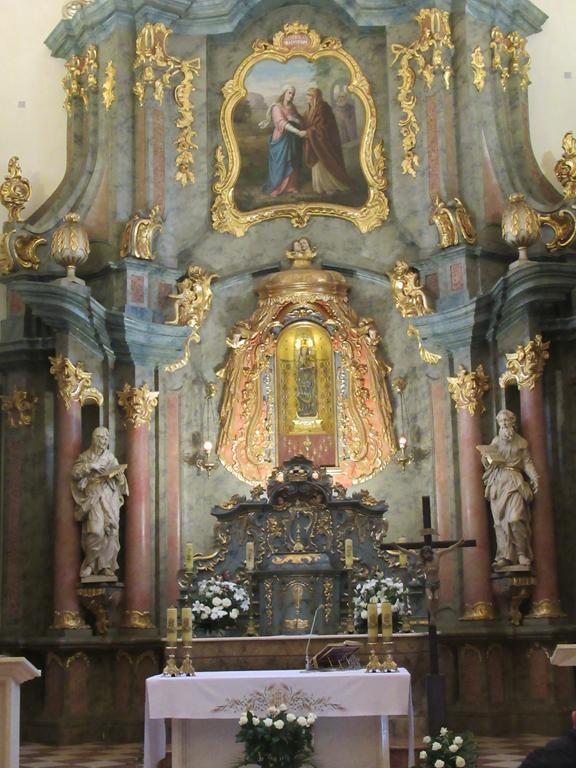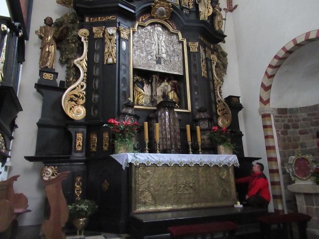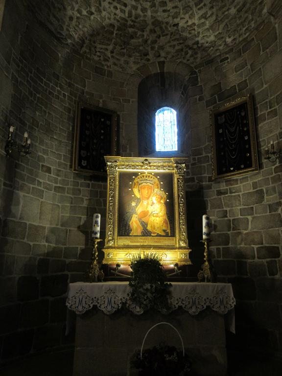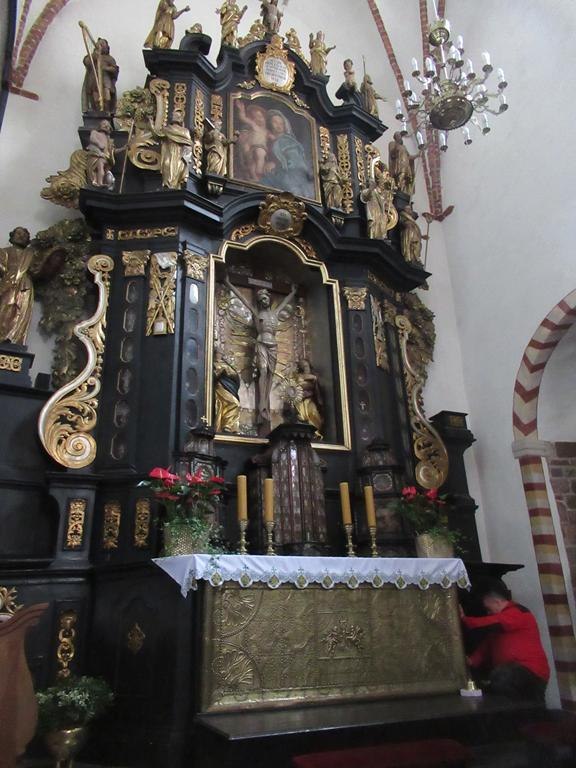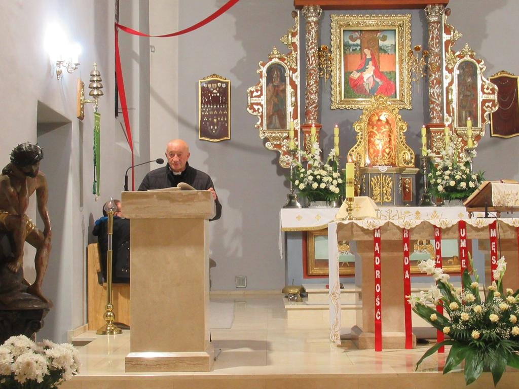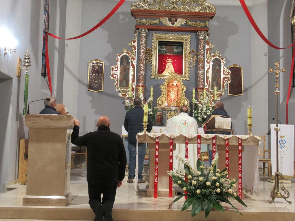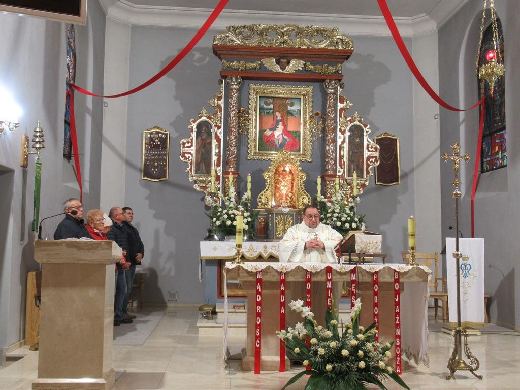 Ostatnim miejscem pielgrzymowania był Gościeszyn. W kościele p.w. Nawiedzenia Najświętszej Maryi Panny ksiądz proboszcz odprawił Mszę św. w intencji pielgrzymów oraz parafian z Kamieńca i Szydłowa. Po Eucharystii proboszcz tamtejszej parafii przybliżył historię obrazu Matki Bożej Gościeszyńskiej. Zapoznał z bogatą symboliką zawartą na namalowanym w latach 1480-1490 wizerunku „Matki Boskiej z Dzieciątkiem w ogrodzie mistycznym.”