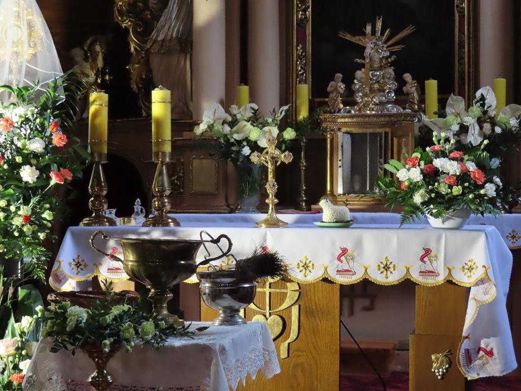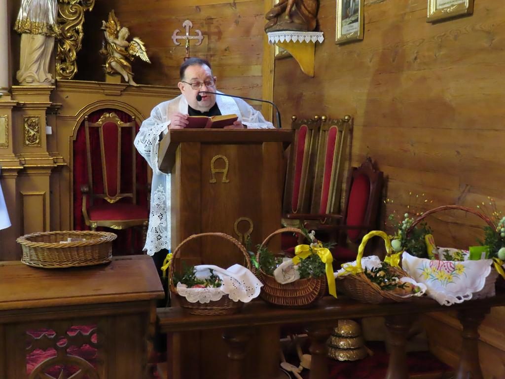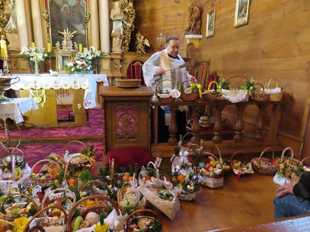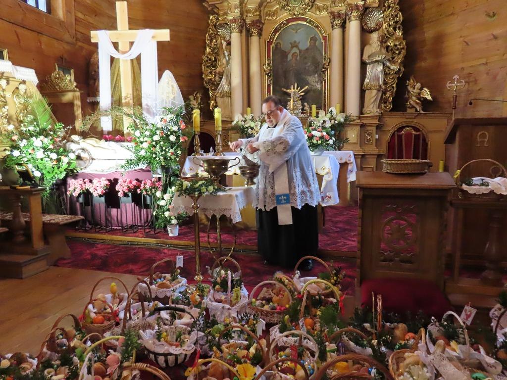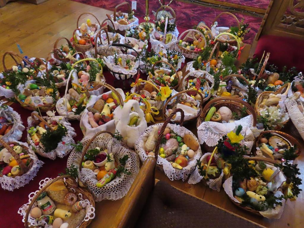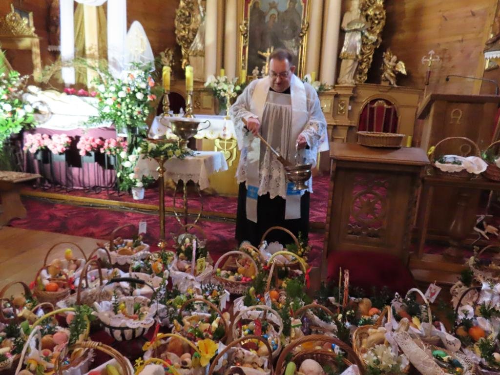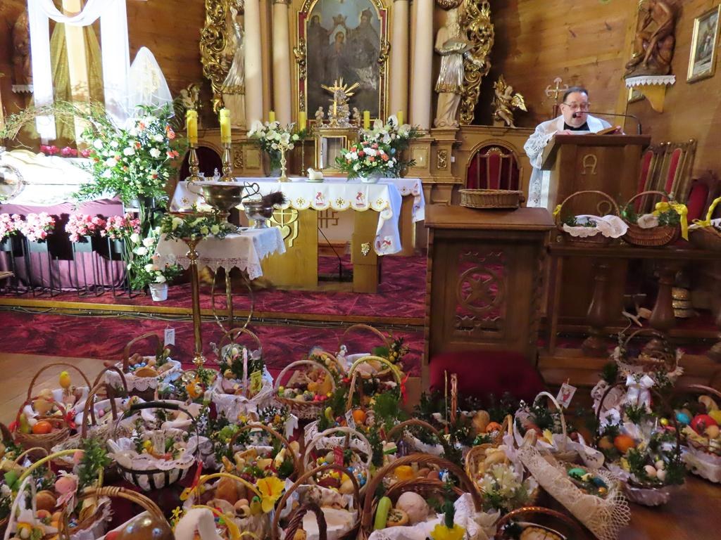 Przyniesione do kościoła przez wiernych na godz. 10.00 i 11. 30 koszyczki wypełnione tradycyjnymi potrawami ksiądz proboszcz po odmówieniu modlitw błogosławieństwa poświęcił. Każdy z przyniesionych produktów ma określone znaczenie. Jajka to symbole życia, odrodzenia i płodności. Baranek to znak Chrystusa zmartwychwstałego, symbol odradzającego się życia i zwycięstwa nad śmiercią. Chleb odnosi się do Ciała Chrystusa, podstawy codziennego życia, dobrobytu i dostatku. Chrzan kojarzy się z goryczą Męki Pańskiej, która jednak prowadzi do zwycięstwa oraz z siłą i zdrowiem. Sól ma chronić przed zepsuciem i oznacza oczyszczenie.