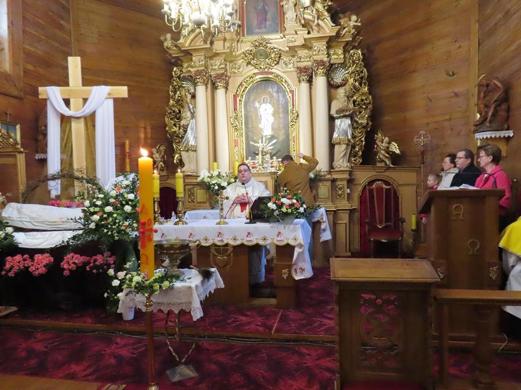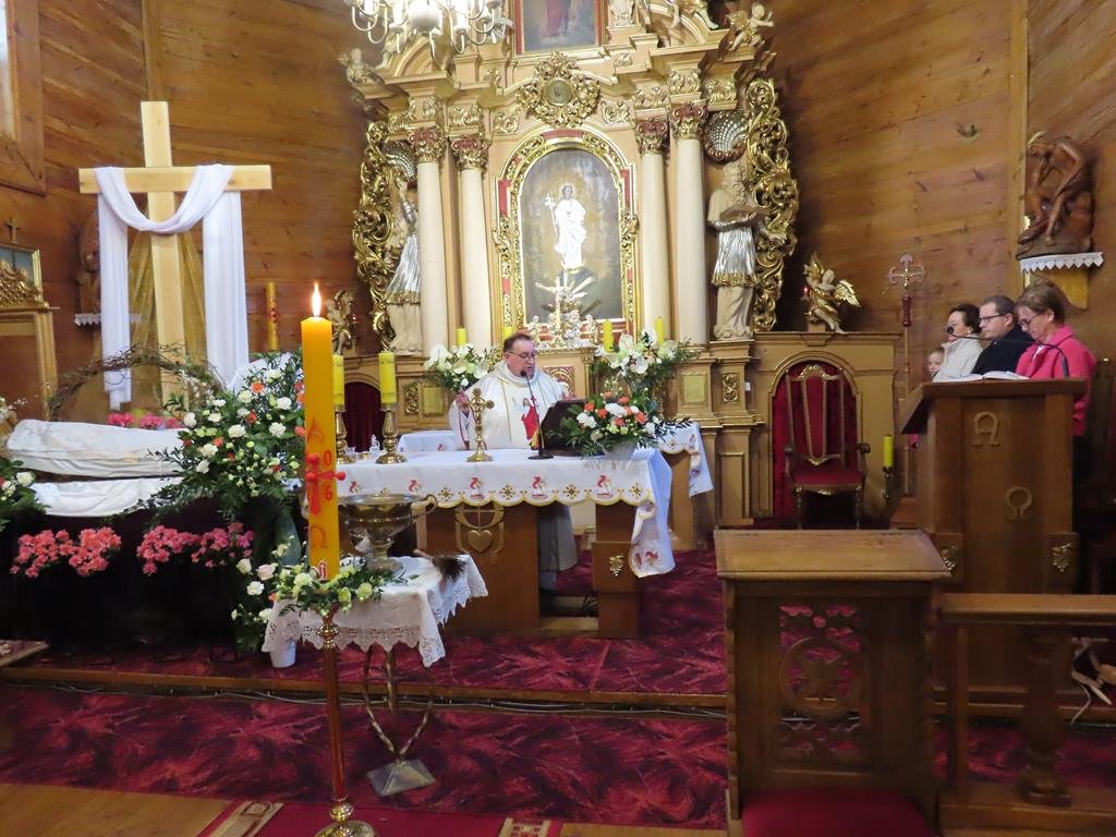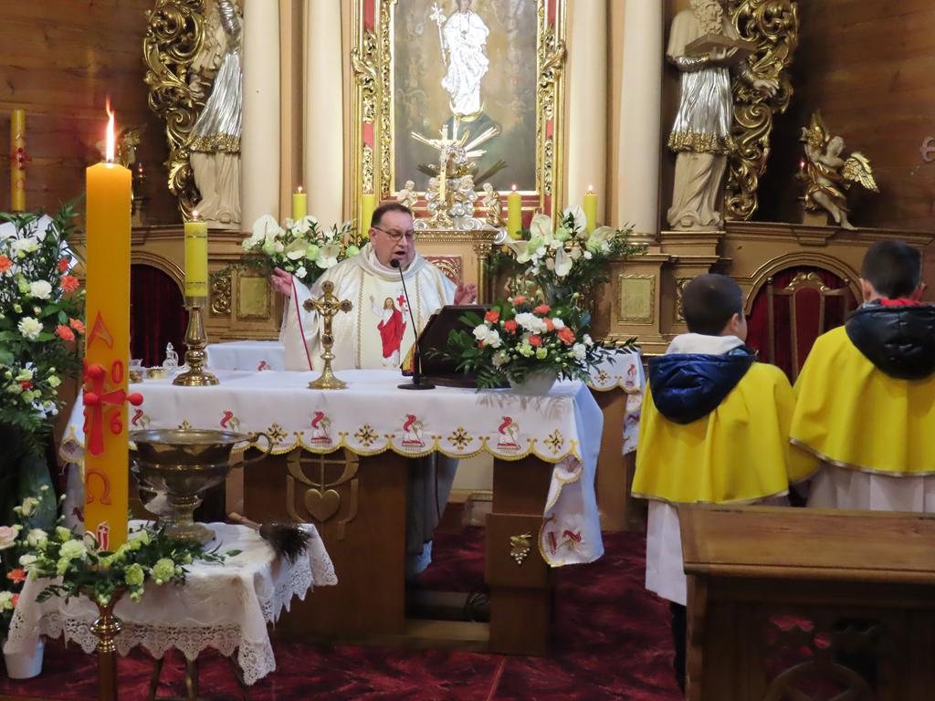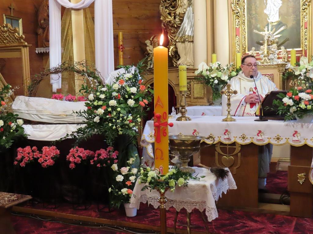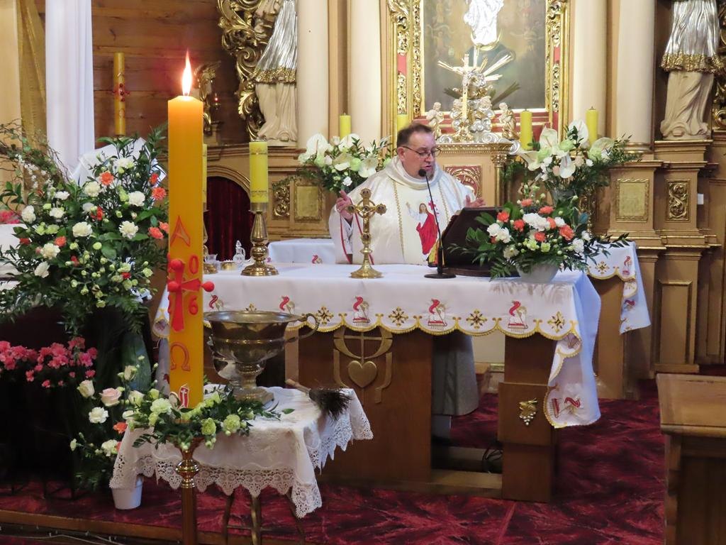 Podczas liturgii Eucharystii Jezus zaprosił wiernych do stołu, chcąc karmić wszystkich swoim Ciałem i Krwią. Pascha Chrystusa uobecniła w sposób sakramentalny mękę, śmierć i zmartwychwstanie. Błogosławieństwo oraz świąteczne życzenia księdza proboszcza zakończyły uroczystość. Przewodnikiem po pełnej symboliki Wigilii Paschalnej była pani Renata Szumera.