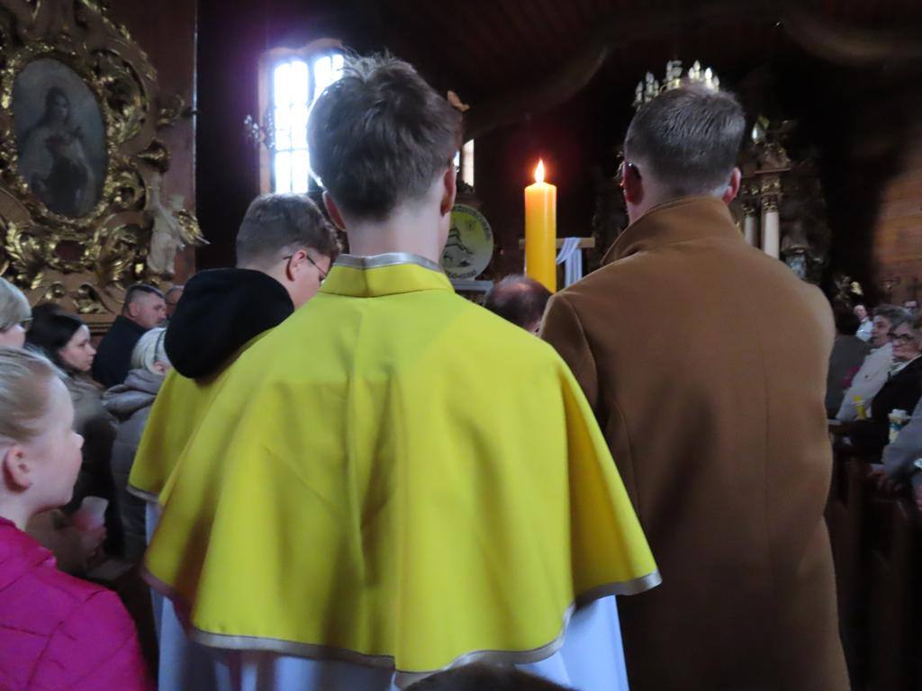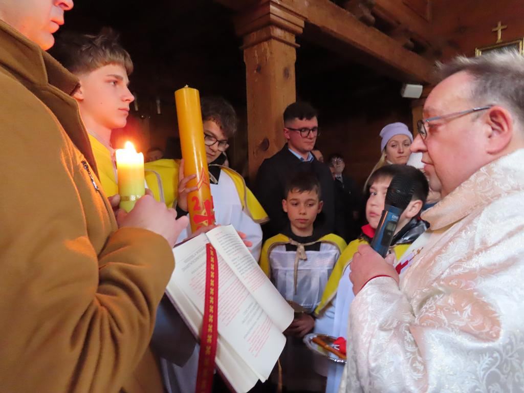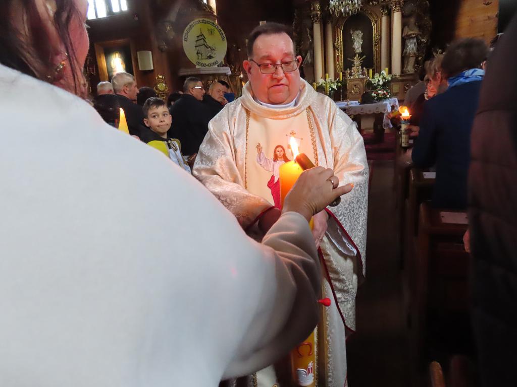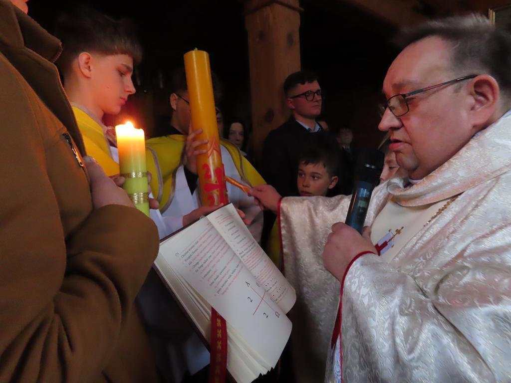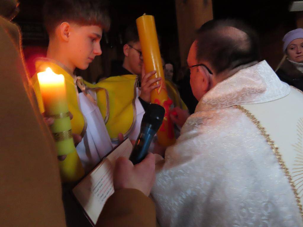 Liturgię zapoczątkowało poświęcenie ognia i świecy paschalnej – symbolu Chrystusa, Światłości Świata. Kapłan oznaczył świecę znakiem krzyża, literami Alfa i Omega, liczbą bieżącego roku oraz wbił pięć gron, symbolizujących rany Chrystusa. Po zapaleniu paschału od poświęconego ognia, kapłan przeszedł w kierunku ołtarza przy trzykrotnym wezwaniu Światło Chrystusa i odpowiedziach Bogu niech będą dzięki. Od płomienia paschału wierni odpalali swoje świece, które wraz z zapalonymi lampami oświetliły kościół – światło pokonało ciemność. Pełnym radości śpiewem Exultet kapłan ukazał tajemnicę tej świętej nocy.